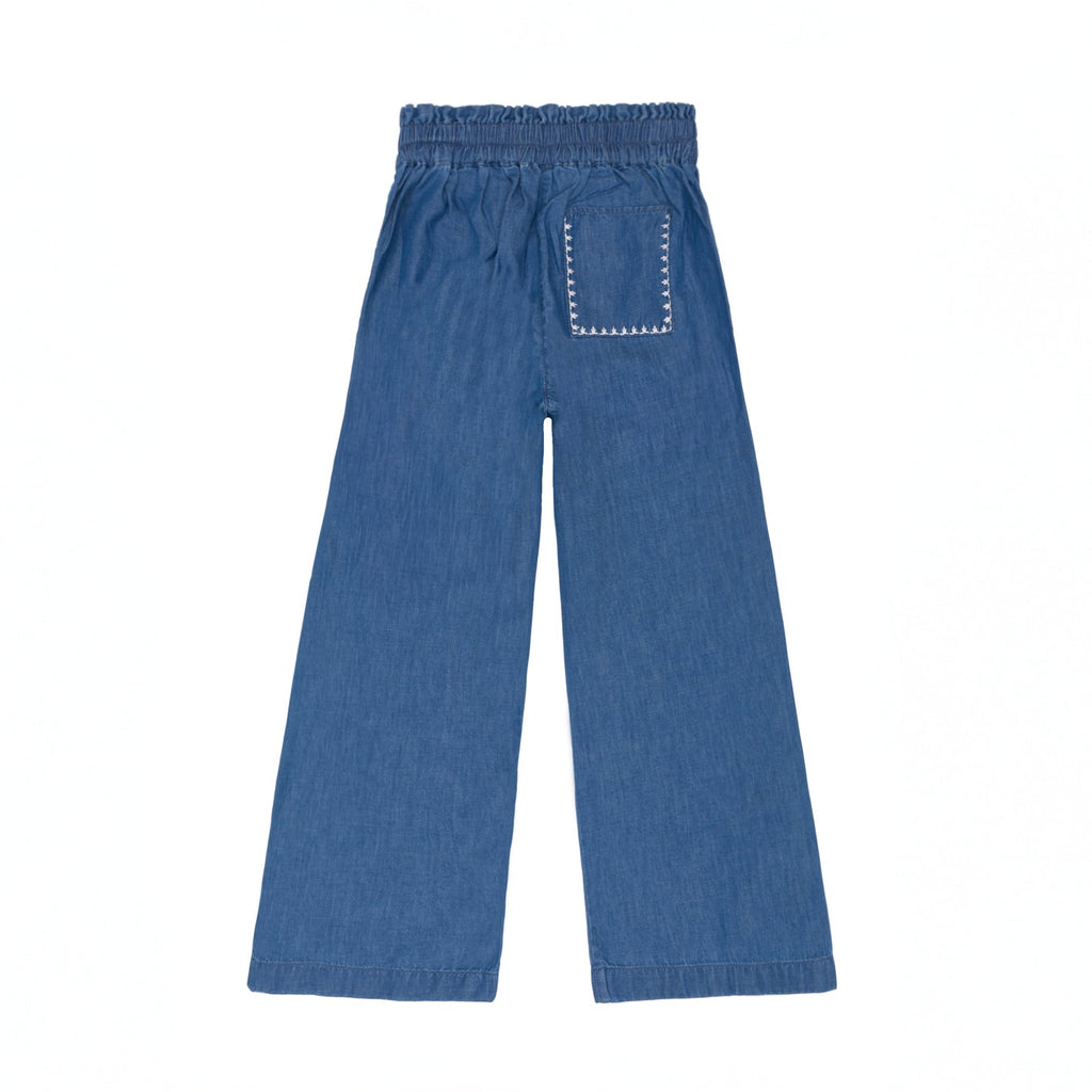 Chambray fabric with embroidered detailing. Wide-leg silhouette. Elasticized waistband. Soft stretch for comfort.