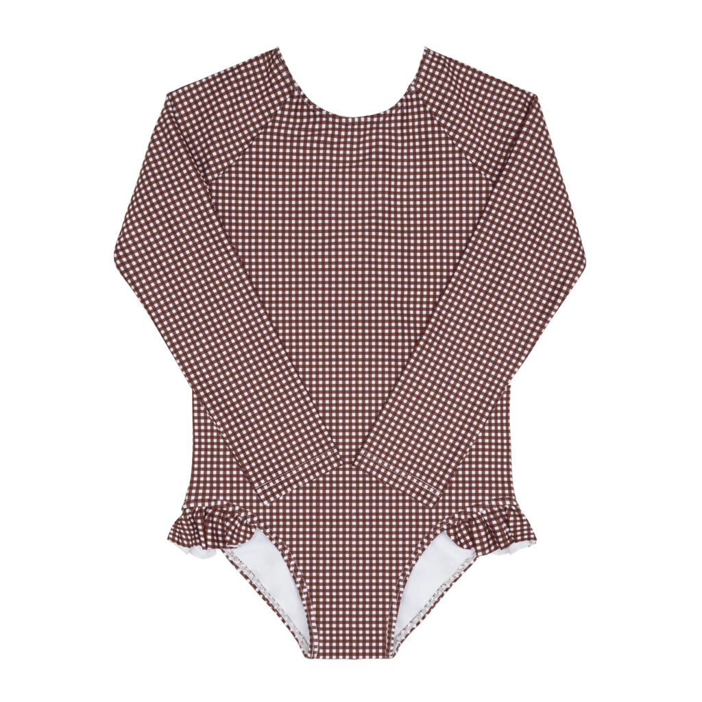 UPF 50+ sun protection. Cocoa gingham print. Fixed grosgrain back tie with hidden button closure. Ruffle hip detail.