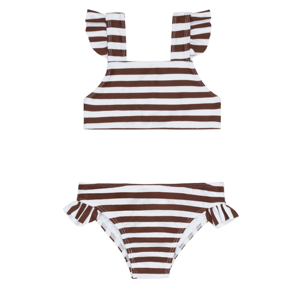 Cocoa stripe print. Square neckline. Ruffle strap and hip detailing. Adjustable tie back. Two-piece set. Fully lined.