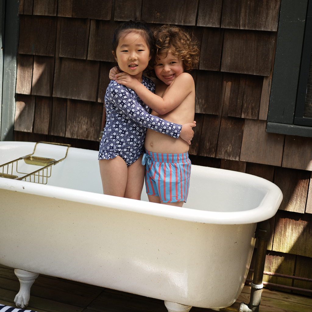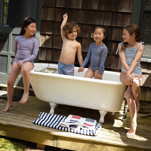 A family favorite for its clean lines and simple details, minnow creates pieces that are playful, polished, and thoughtfully designed for long days, sandy toes, and the wonderment of life on the shore. Your little one will love the look, and you'll love the protection, of the Girls Ditch Plains Daisy Rashguard One Piece. Decorated with a gorgeous gingham print, a cute ruffle at the thigh, and chic grosgrain ribbon tie back, this long sleeved one piece is fully lined, except for the sleeves, for your little one's comfort. It's a suit you'll both love.