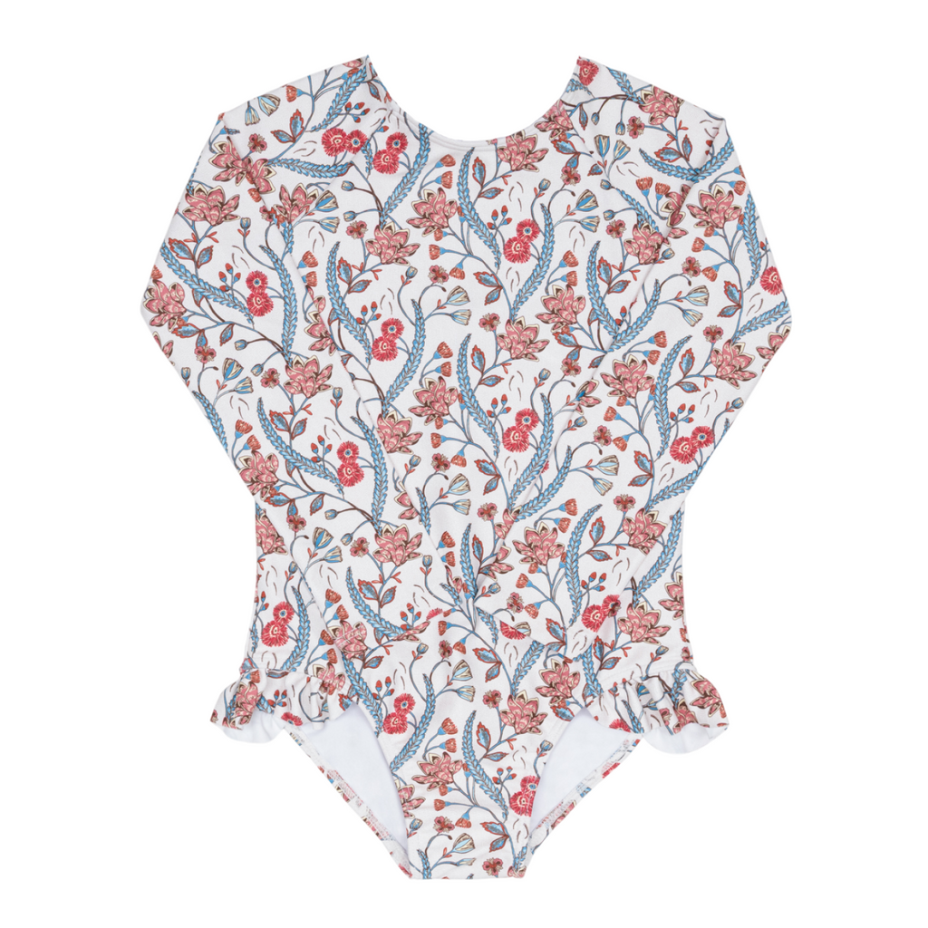 UPF 50+ sun protection. Mercado Bloom floral print. Fixed grosgrain back tie with hidden button closure. Ruffle hip detail.