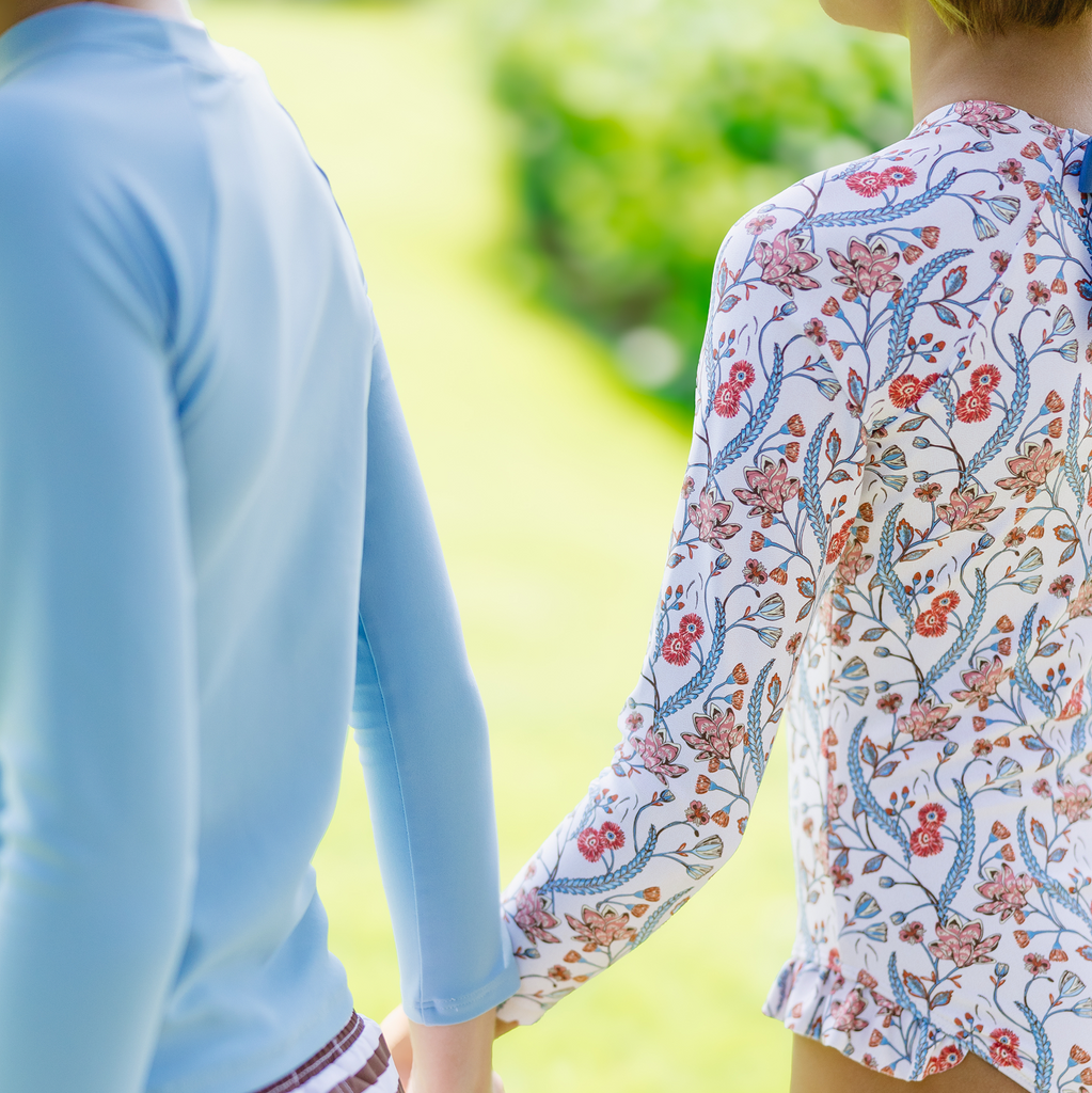 The Girls’ Mercado Bloom Rashguard One Piece brings a vibrant, polished feel to Minnow’s signature sun-safe silhouette. Designed in a lively floral print, it features a chic grosgrain back tie secured with a hidden button for easy changes. A soft ruffle at the hip adds a feminine touch to this comfortable warm-weather staple.