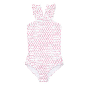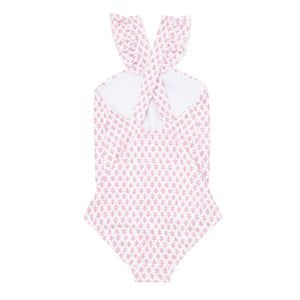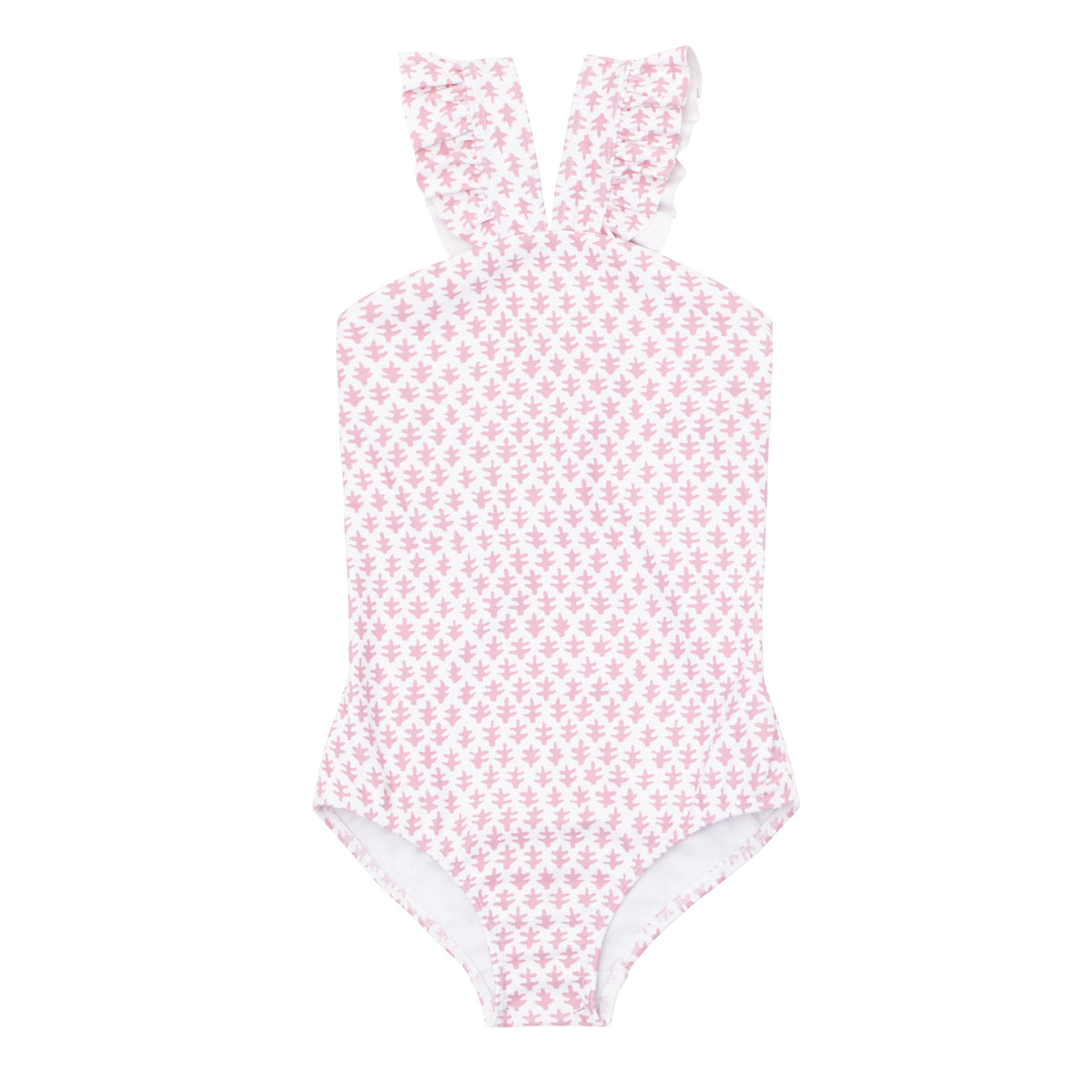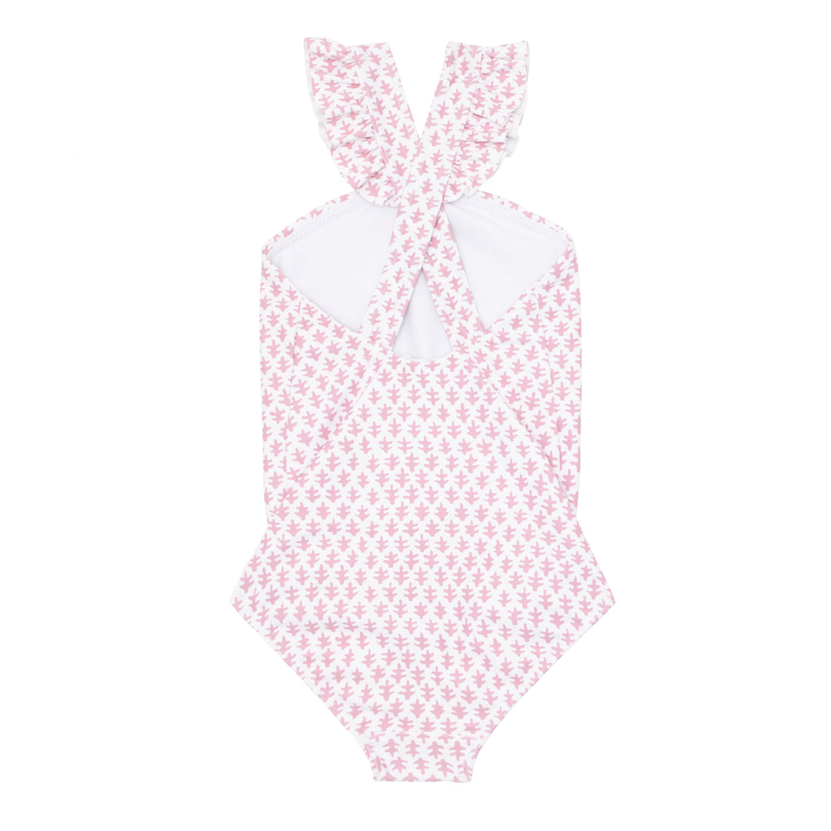 A family favorite for its clean lines and simple details, minnow creates pieces that are playful, polished, and thoughtfully designed for long days, sandy toes, and the wonderment of life on the shore. A new silhouette, this version of Girls Sea Marsh Floral V-Neck Crossover One Piece comes in a beautiful nectar leaf print from Sister Parish, and features a unique v-neck and criss-crossed back. It's an easy shape and a cute classic, all in one. She won't want to take it off.