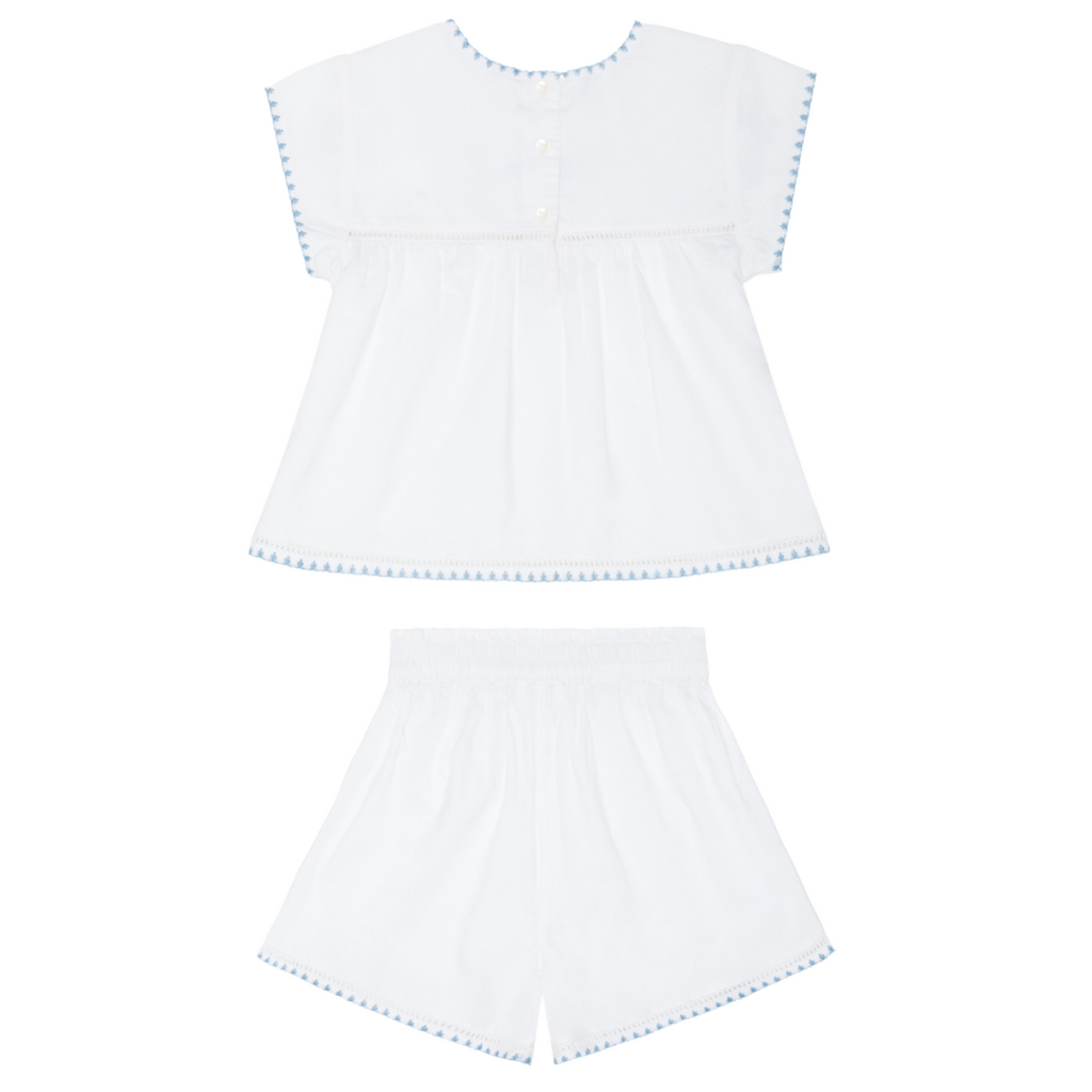 The Girls’ White Embroidered Cap Sleeve Top and Short Set pairs breezy ease with sweet, thoughtful detailing. Designed for warm, sun-filled days, the lightweight cap sleeve top complements the pull-on shorts for an effortless, polished look. Wear it as a set or mix and match with other Minnow favorites.