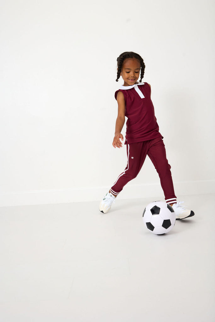 A polished blend of style and sport, Courtside Kids reimagines children’s activewear with performance fabrics, modern tailoring, and a classic athletic sensibility—made for everywhere from the playground to the country club. The Girly Girl Tank in Maroon & White is a chic blend of sporty function and feminine flair. Crafted from lightweight performance fabric, this versatile top moves effortlessly from the court to casual afternoons and family dinners, keeping her comfortable and confident through every serve and spin.