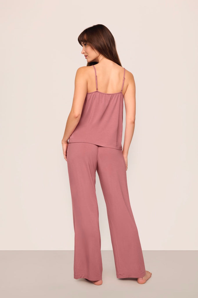 95% TENCEL™ Modal, 5% spandex. Scoop-neck cami with soft shirring at center. Adjustable straps. Mid-rise straight leg pant. Elastic waistband with drawstring. Side pockets. Comfortable fit. Berry Blush & Ivory color.