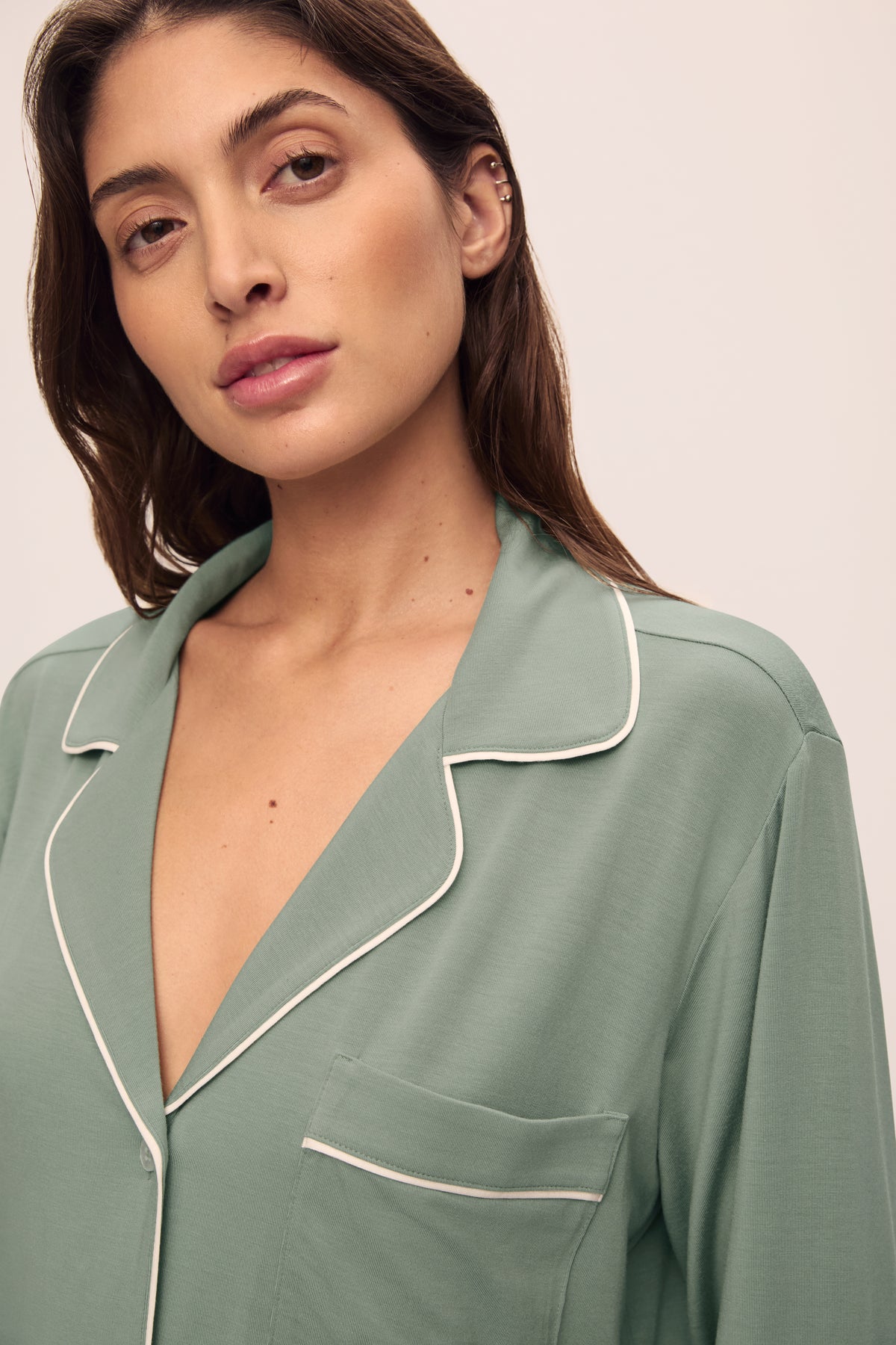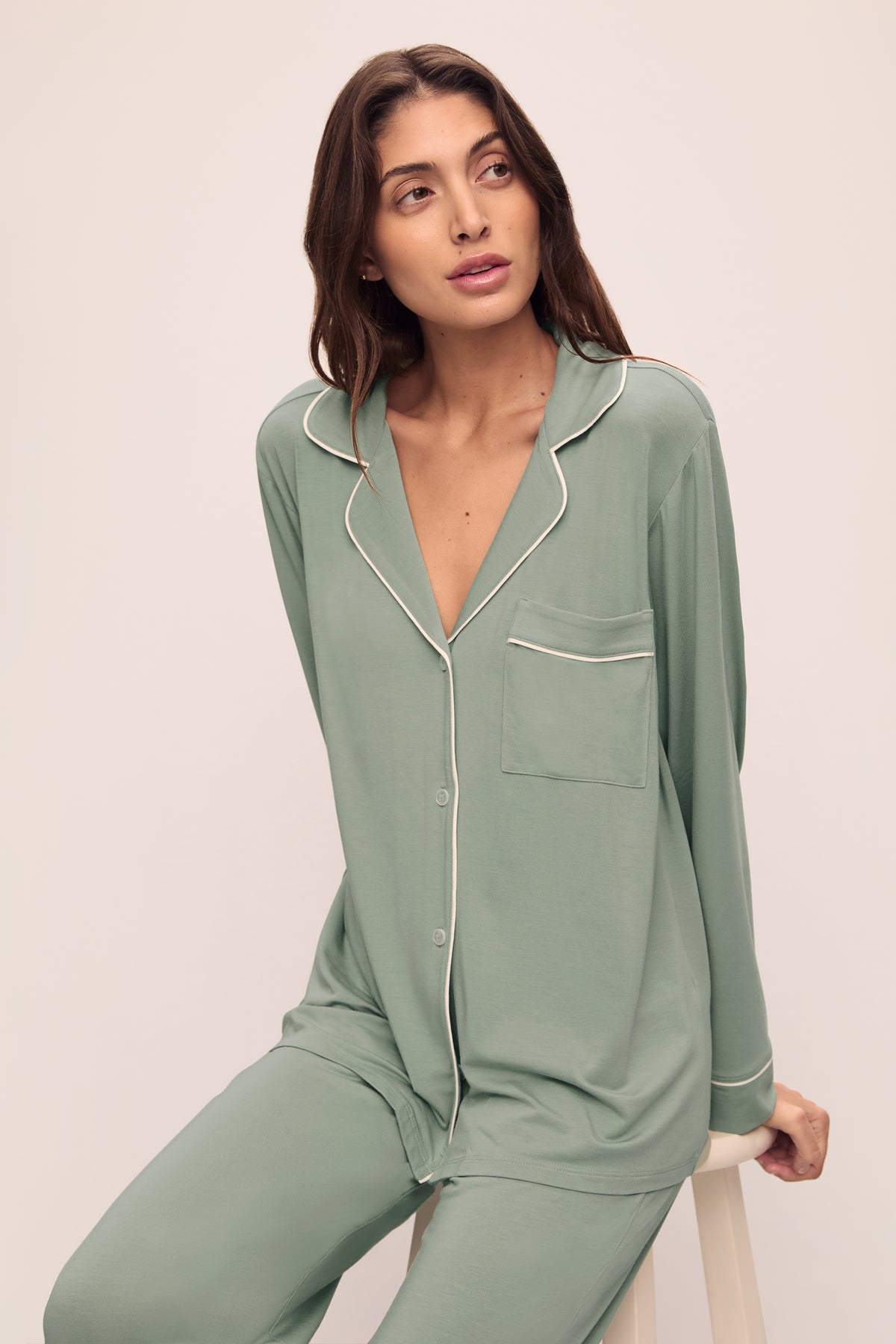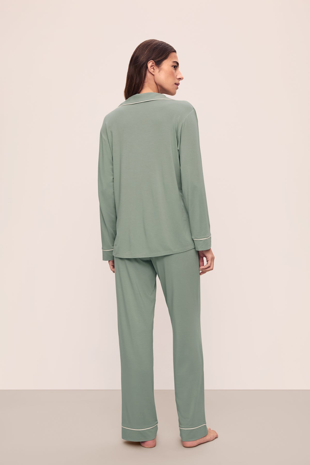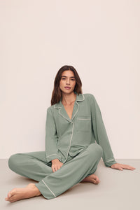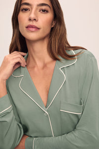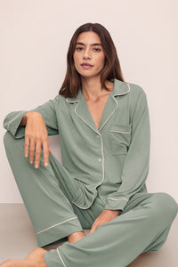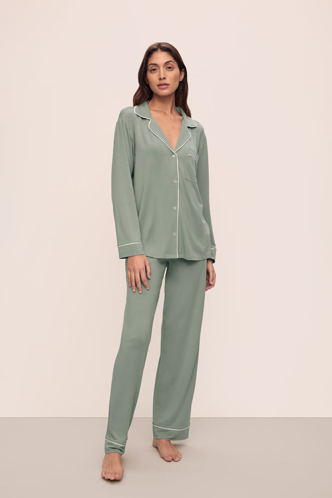 In 1996, Eberjey co-founders Ali and Mariela understood the visceral desire for beautiful, functional sleepwear that supported sleep and individual style. At last, pajamas can be sensual, comfortable, tailored, and effortless. Featuring temperature-regulating knit fabric, the Gisele Long PJ Set in Eucalyptus Ivory may very well be the world’s softest pajamas. This relaxed long sleeve set features contrast piping, a button-front top with a notch collar and functional pocket, and a low-rise straight leg pant with a thin elastic waistband
