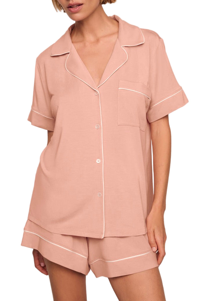 Designed for luxurious comfort, the Gisele Relaxed Short PJ Set in Velvet Pink & Ivory offers a fresh take on a classic silhouette. Crafted from TENCEL™ Modal fibers with a touch of spandex, the silky, temperature-regulating knit fabric drapes beautifully and feels gentle on the skin. The relaxed short-sleeve top features a button front, notch collar, and functional pocket, while the mid-rise boyfriend short has a thin elastic waistband and contrast piping—an effortless combination of ease and elegance.