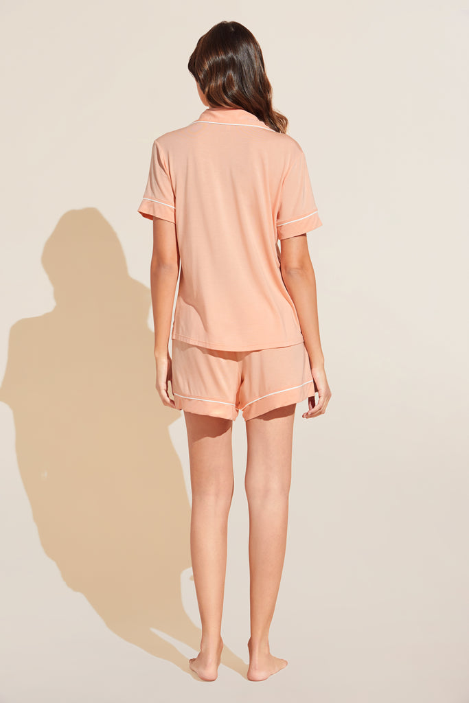 95% TENCEL modal, 5% spandex. Button front top with notch collar and functional pocket. Mid-rise boyfriend fit short with thin elastic waistband. Contrast piping.