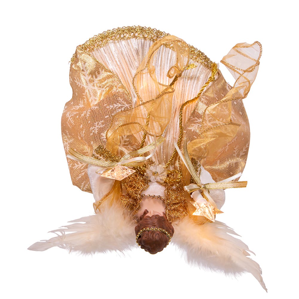 Since 1946, Kurt Adler has defined holiday tradition with designs that inspire nostalgia, festivity, and timeless beauty year after year. A family-run company, the brand believes that every ornament holds sentimental value and is a pathway to vivid, joyful memories. The Gold Angel Treetop is an illuminated design dressed in a golden gown with brocade trim, ribbons, and feathered wings. Glowing with 10 clear incandescent bulbs, she adds a radiant, traditional touch to the top of your Christmas tree.