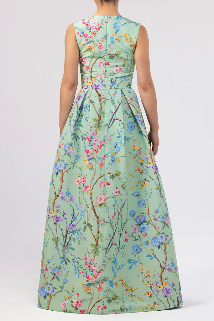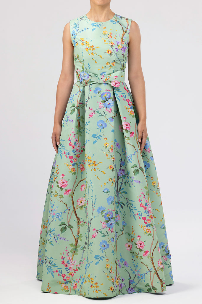 The Grace Garden Reverie Silk Faille Ball Gown with Bow Belt in Celadon Floral from the Alexia María and Scalamandré for Over The Moon collection embodies classic femininity. Crafted in one-of-a-kind silk faille fabric with Scalamandré’s hand-painted Garden Reverie floral print, the sleeveless gown features a fitted bodice, voluminous pleated skirt, and a removable bow belt for a refined touch of Alexia María glamour. Handcrafted in Alexia María’s California atelier, this seasonless style is made for wedding celebrations, spring events, and elegant summer occasions.