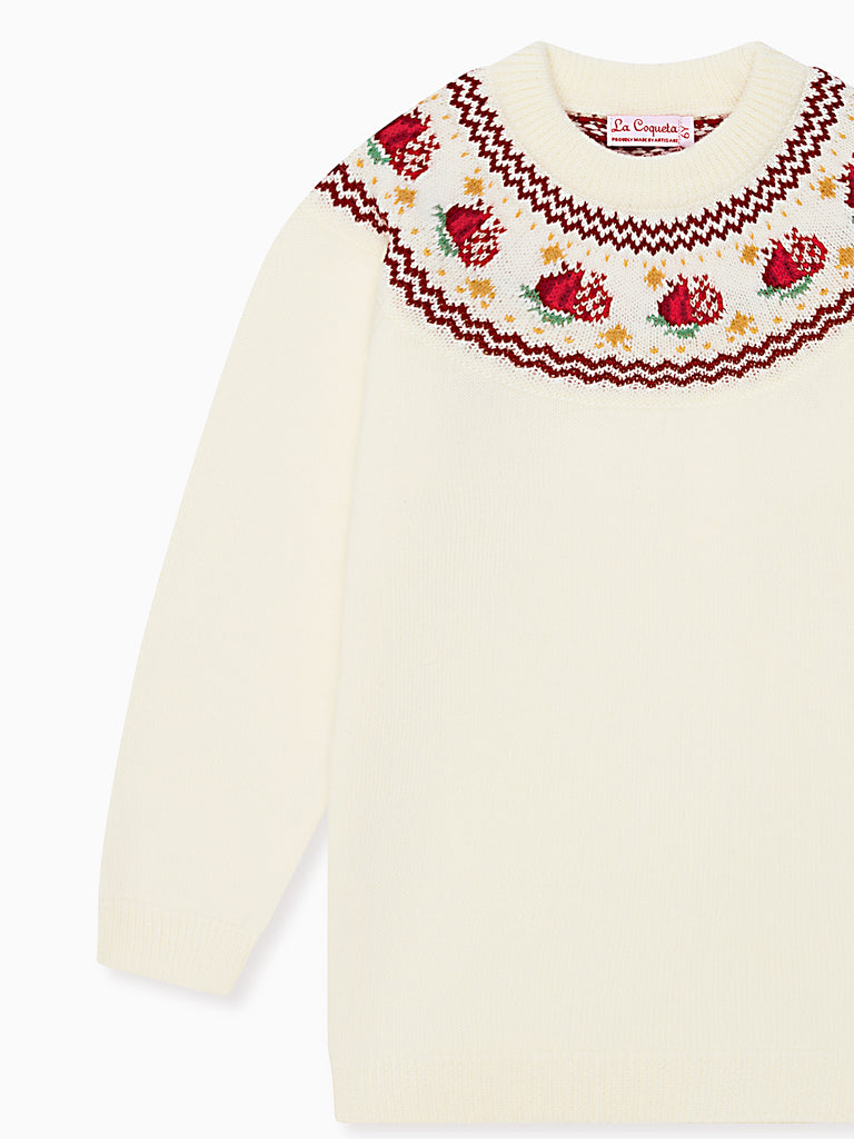 La Coqueta is renowned for its meticulous attention to detail, perfecting every silhouette with care. The Grenada Merino Fair Isle Girl Jumper, thoughtfully designed in Notting Hill and crafted by skilled artisans in Spain, exemplifies this dedication. Featuring a boxy fit and elegant knitted blouson sleeves, it drapes effortlessly for a refined yet relaxed look. Spun from luxuriously soft Merino wool, this fine gauge knit offers breathability and comfort, ideal for all-day wear. Presented in a versatile ivory hue, it boasts a chic crew neck adorned with intricate intarsia Fair Isle patterns on the yoke in tones of red, mustard, and green. Style it over cotton-rich jeans or tuck it into one of La Coqueta's signature skirts or dungarees for a polished, layered look.