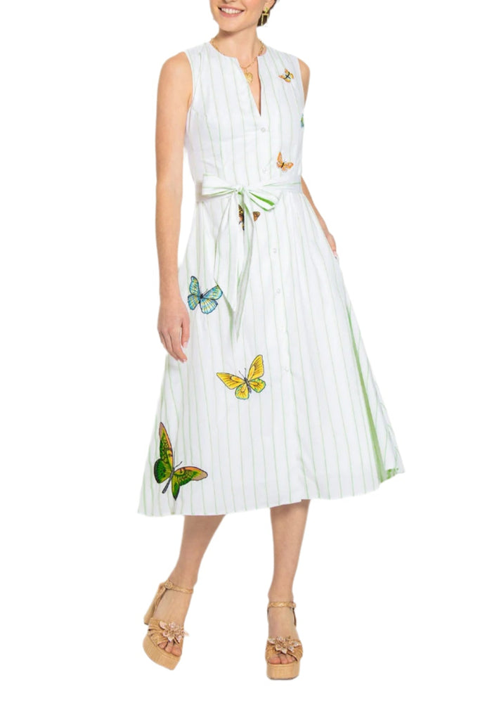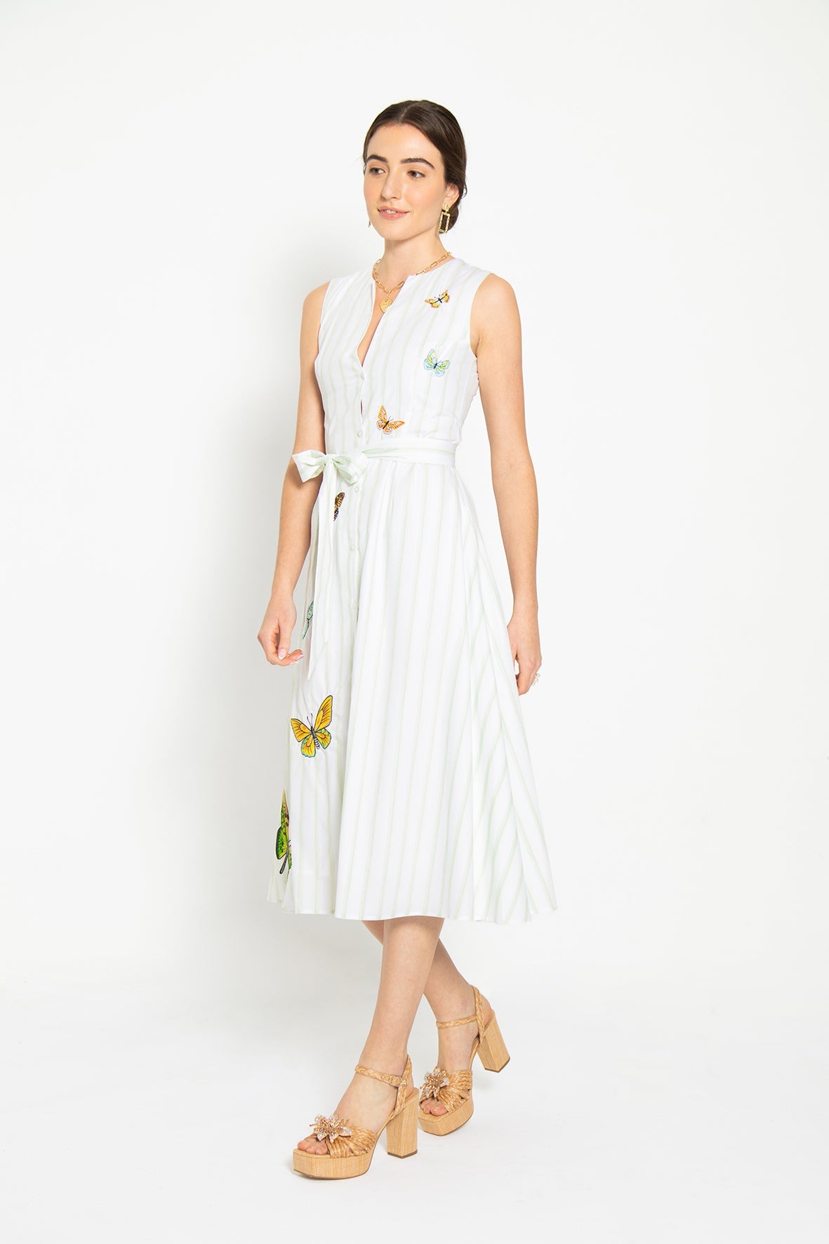 100% cotton. Sleeveless midi dress with a V-neckline, button-front closure, and optional waist tie. Subtle green pinstripes throughout with all-over butterfly embroidery. Length: 48.5".