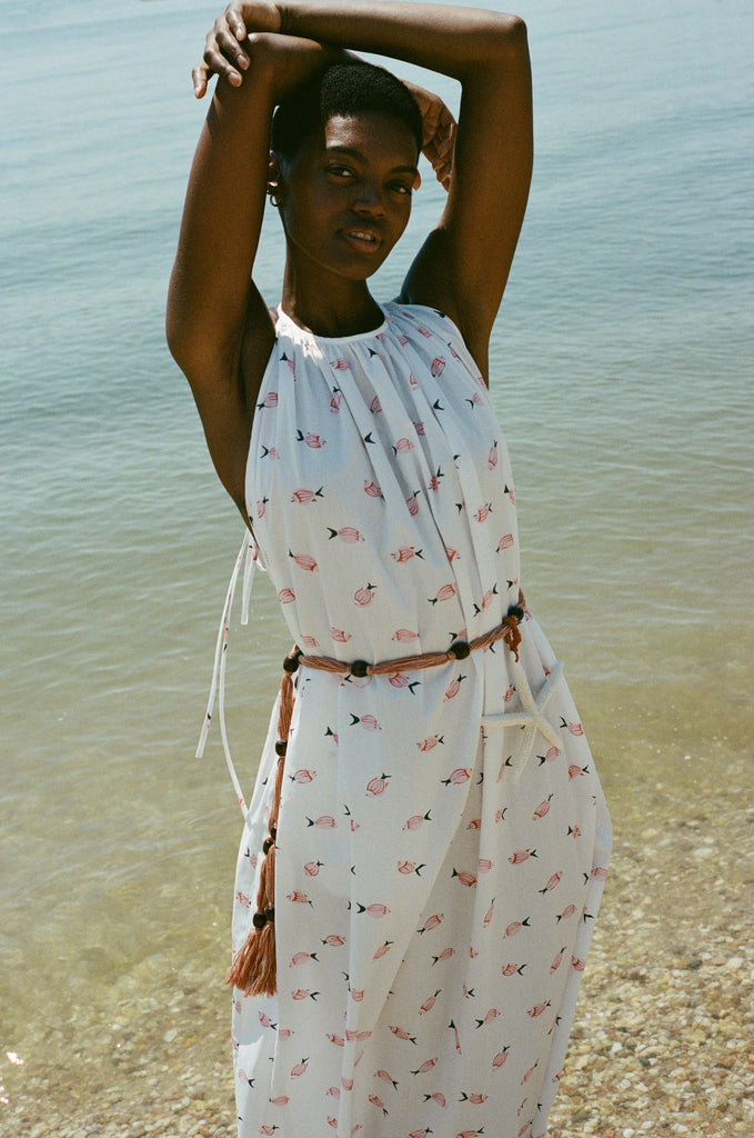 The Halter Dress in Vintage Pink Fish is crafted from soft, structured cotton and designed with a clean crew neckline secured by a thin, adjustable tie. Gentle shirring from the neck creates an easy, fluid silhouette that falls to the ankle, balanced with discreet pockets for everyday ease. An open back lends a refined touch of lightness, while the thin, detachable belt allows for optional shaping at the waist.
