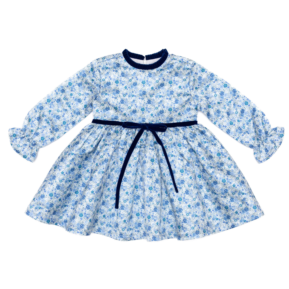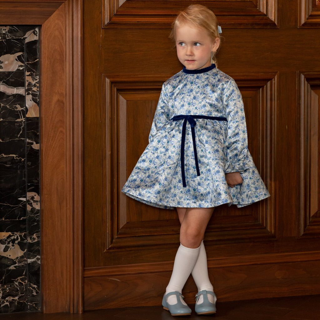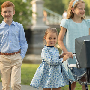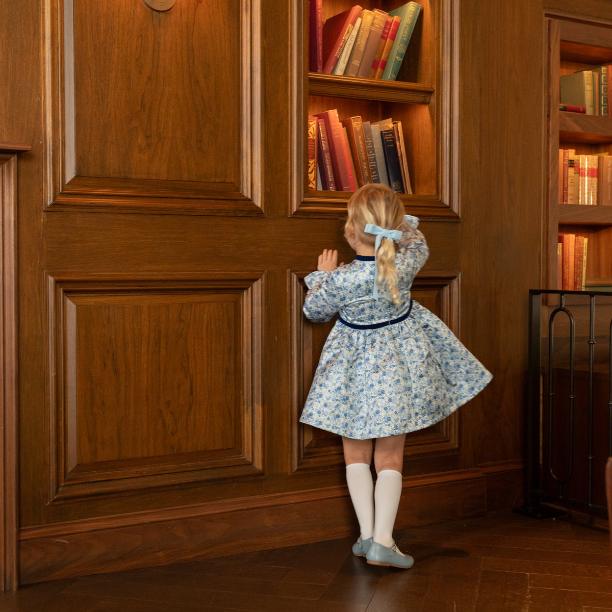 A celebration of the spirit of girlhood, the updated classics from Henry Duvall are curious, imaginative, and sweet. Full of character and playful details, these are easy-to-care-for clothes that families will love. Sweet, classic, and made for twirling—the Hazel Dress in Prescott Petals is a fall favorite for girls of all ages. Crafted in Prescott Petals, a delicate blue floral that coordinates seamlessly with Prescott Plaid, this vintage-inspired silhouette is finished with a charming Back Bay Blue Velvet bow at the waist. Coordinates beautifully with sibling pieces in Prescott Petals, Prescott Plaid, or Back Bay Blue Velvet, and pairs with the Jackie Set for a coordinating mother-daughter look.