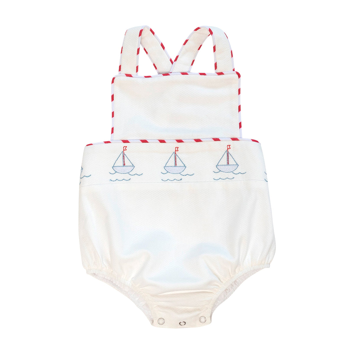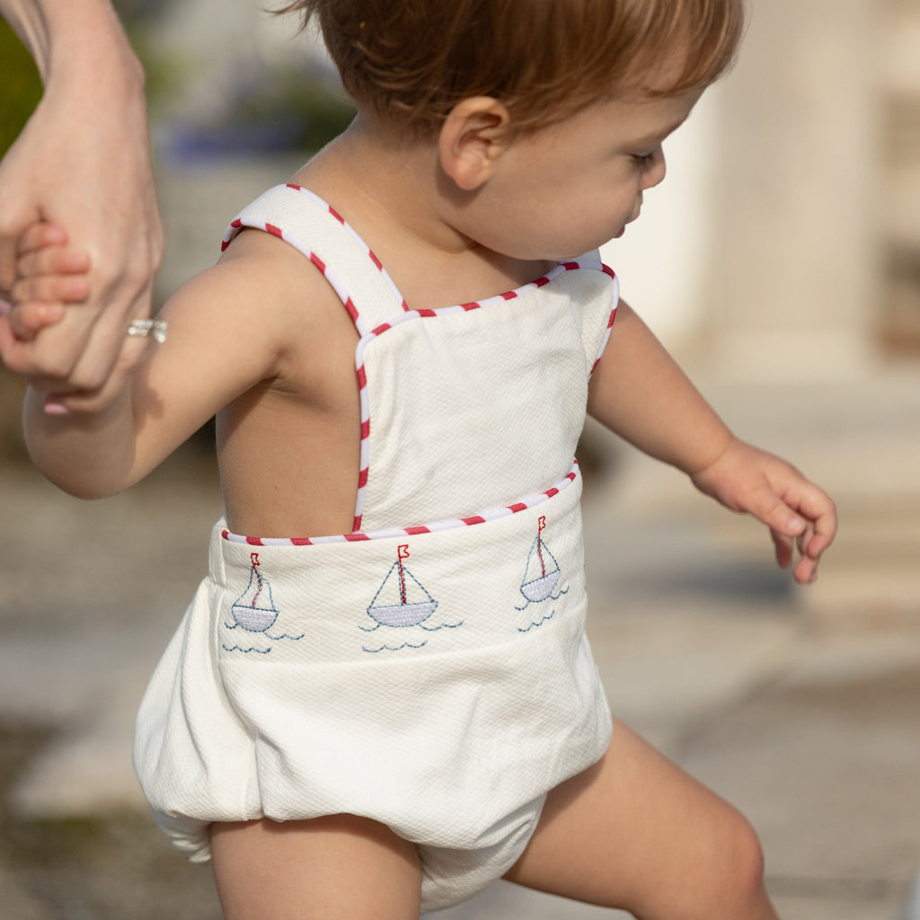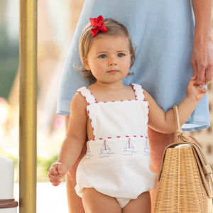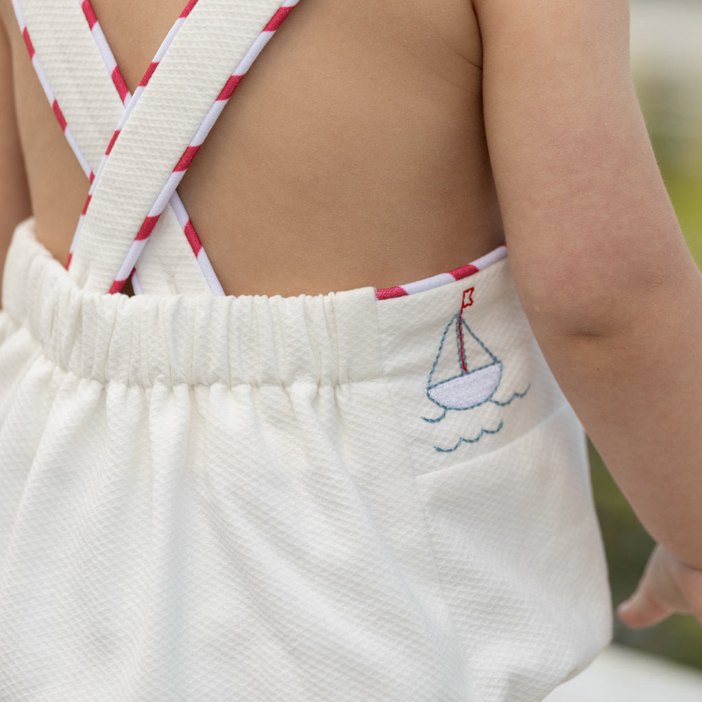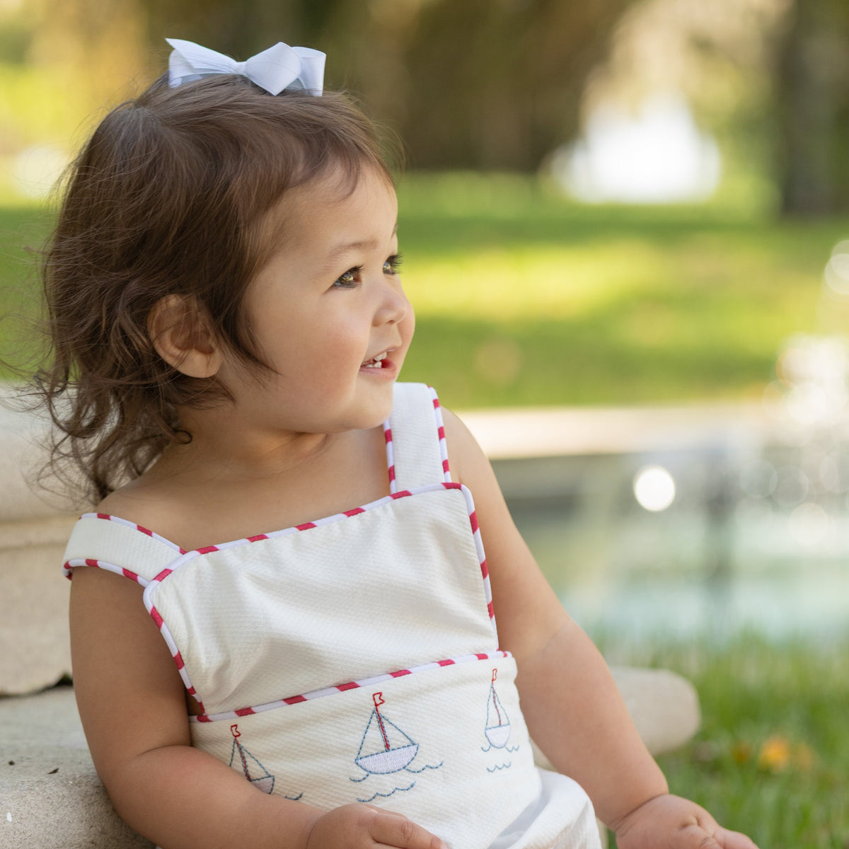 The criss-crossing straps at the back feature three button holes to adjust the size as they grow. Featuring delicate sailboat embroidery and red stripe trim, it coordinates with all our Southampton Sailboats style and with our Laine Dress for women!