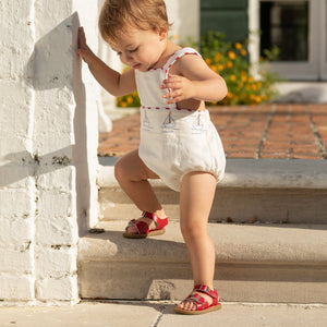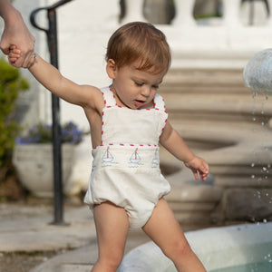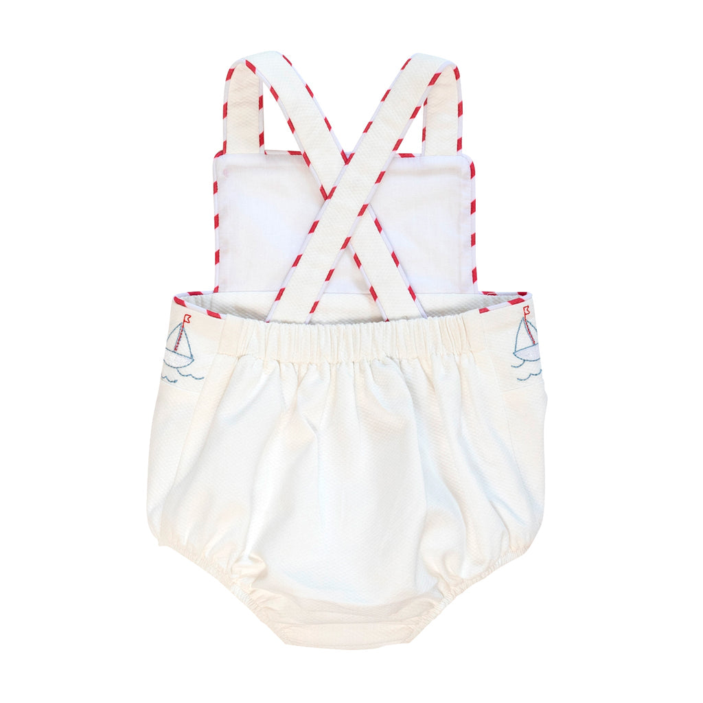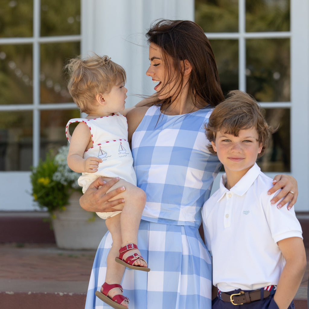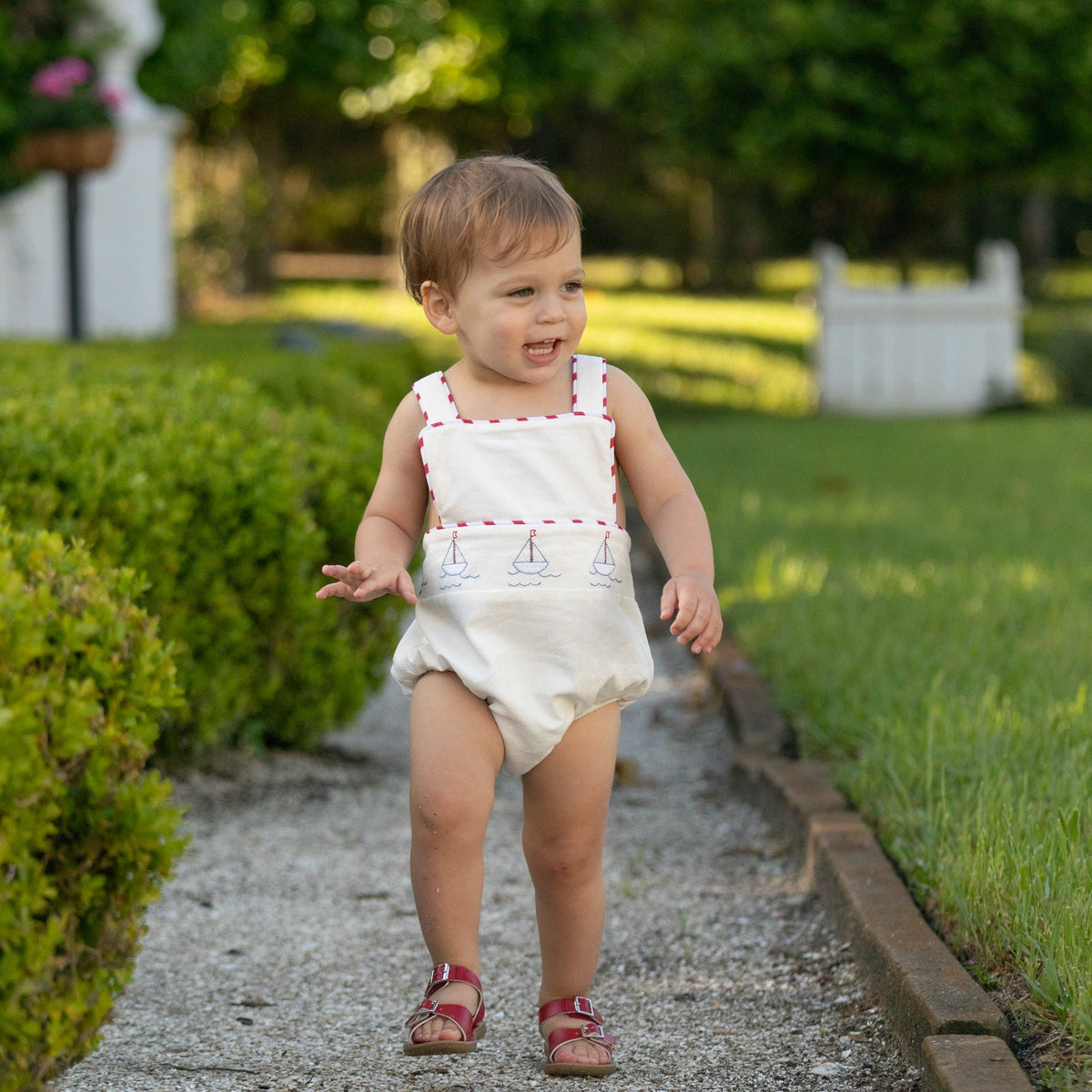 The criss-crossing straps at the back feature three button holes to adjust the size as they grow. Featuring delicate sailboat embroidery and red stripe trim, it coordinates with all our Southampton Sailboats style and with our Laine Dress for women!
