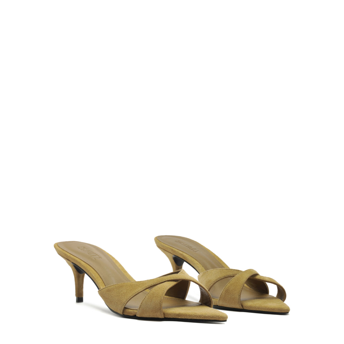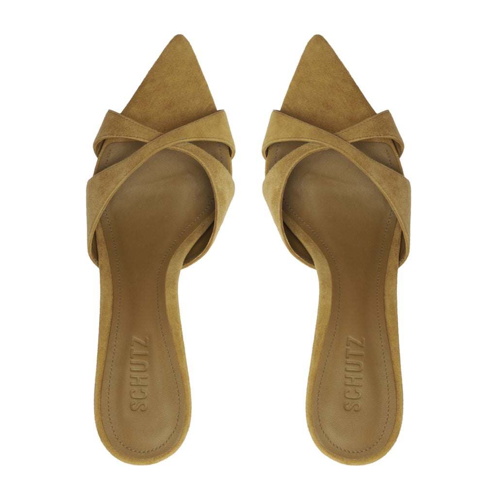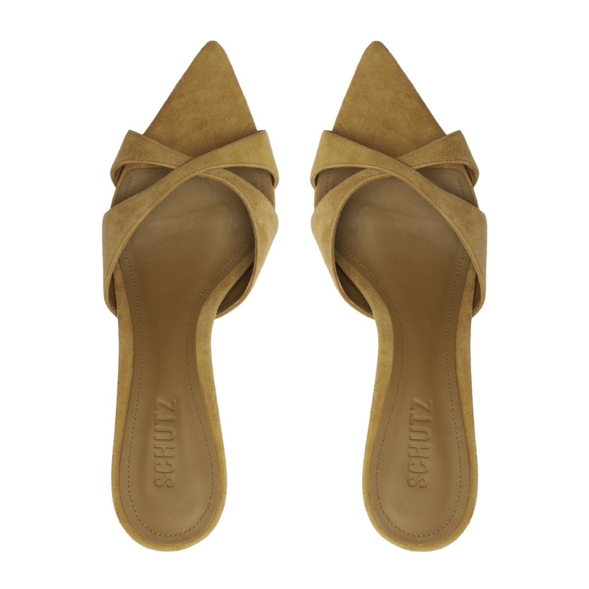 Founded in 1995 by Alexandre Birman, Schutz redefines attainable luxury with its stylish footwear. With each new release, the brand delivers of-the-moment collections, defined by confident, bold, designs around which entire outfits can be built. The Hilda Leaf Mule Suede Sandal in Dried Pistachio brings architectural precision to everyday ease. With a pointed toe and sculptural crossover strap, this mule blends fluid movement with modern edge, crafted for bold strides and standout style.