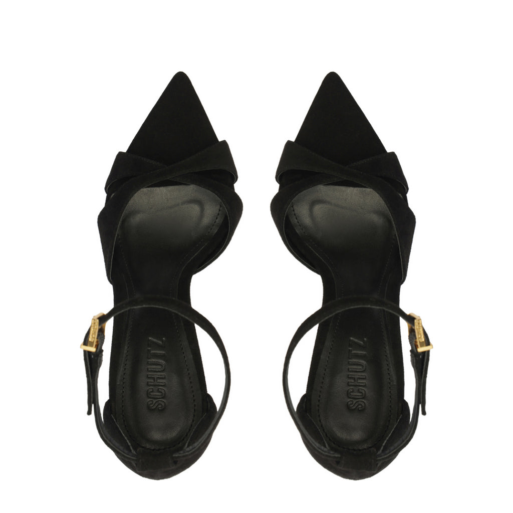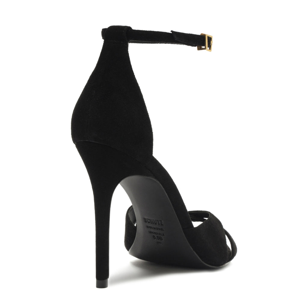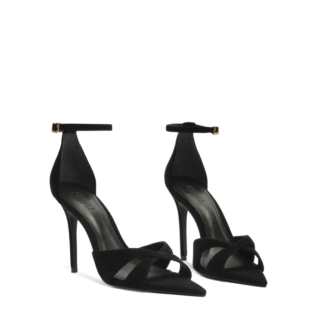 Founded in 1995 by Alexandre Birman, Schutz redefines attainable luxury with its stylish footwear. With each new release, the brand delivers of-the-moment collections, defined by confident, bold, designs around which entire outfits can be built. The Hilda Leaf Suede Sandal in Black is all edge and elevation. Featuring crisscross suede straps, a pointed toe, and a wraparound ankle buckle, this stiletto sandal is sculpted for those who lead with presence—refined, commanding, and unapologetically bold.