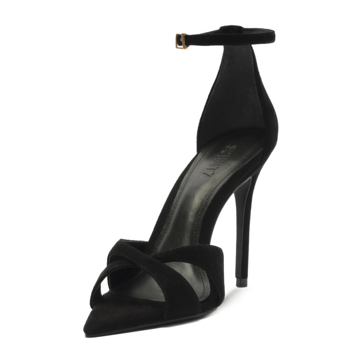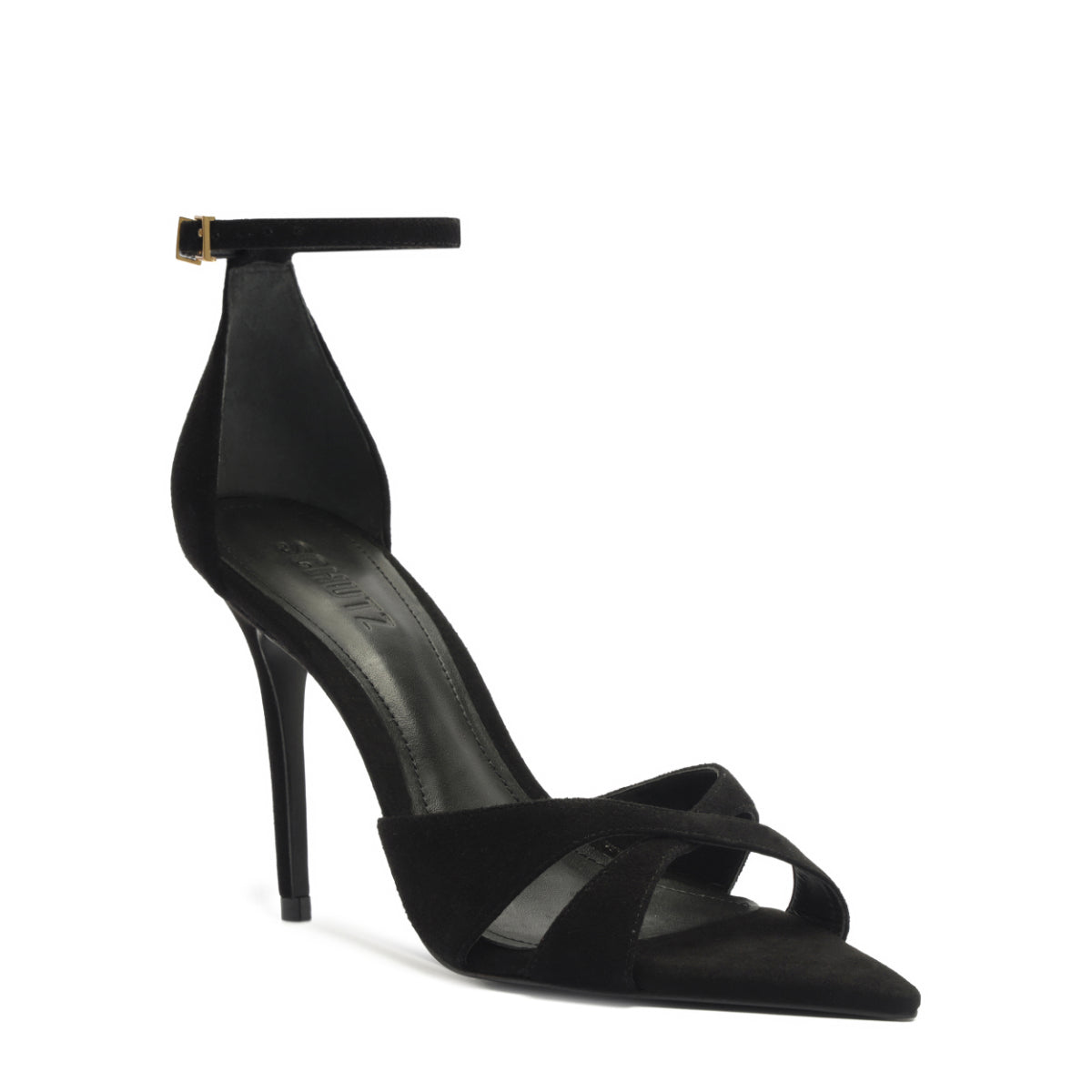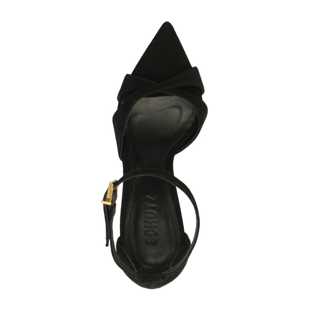 Founded in 1995 by Alexandre Birman, Schutz redefines attainable luxury with its stylish footwear. With each new release, the brand delivers of-the-moment collections, defined by confident, bold, designs around which entire outfits can be built. The Hilda Leaf Suede Sandal in Black is all edge and elevation. Featuring crisscross suede straps, a pointed toe, and a wraparound ankle buckle, this stiletto sandal is sculpted for those who lead with presence—refined, commanding, and unapologetically bold.