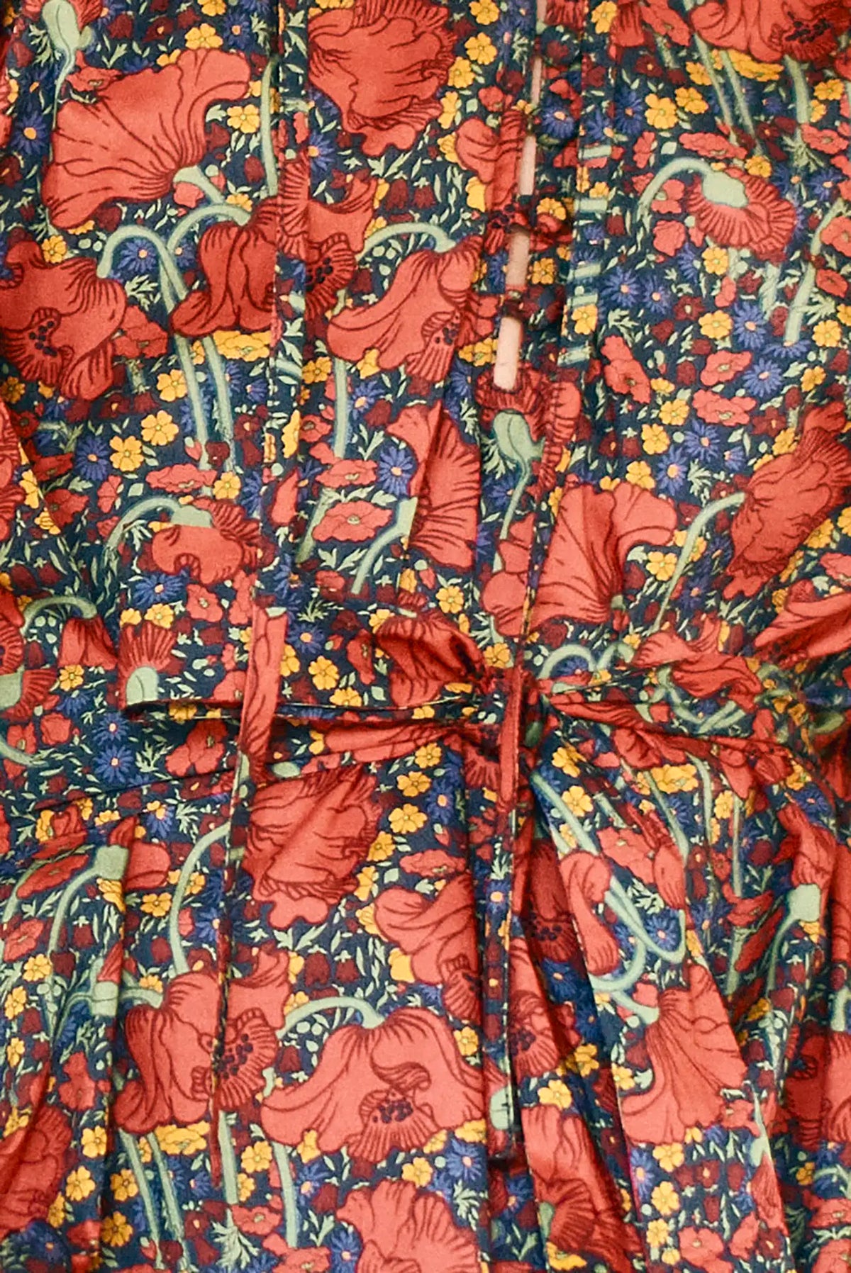 100% cotton poplin. Liberty fabric. Open v-neckline with tie detail. Button placket with gathering at yoke. Elbow-length puff sleeves with adjustable ties. Tiered seams with ruffle detail. Optional sash belt. Pull-over style. Midi length.
