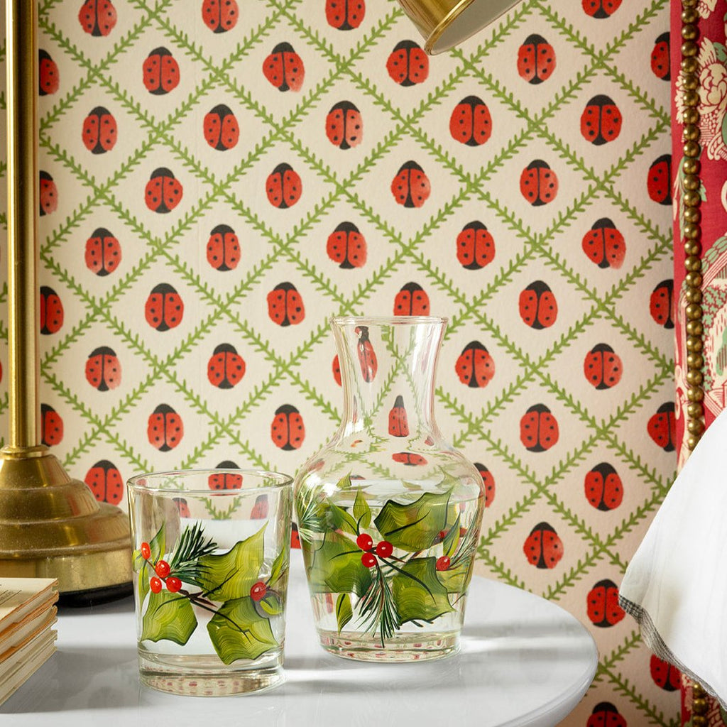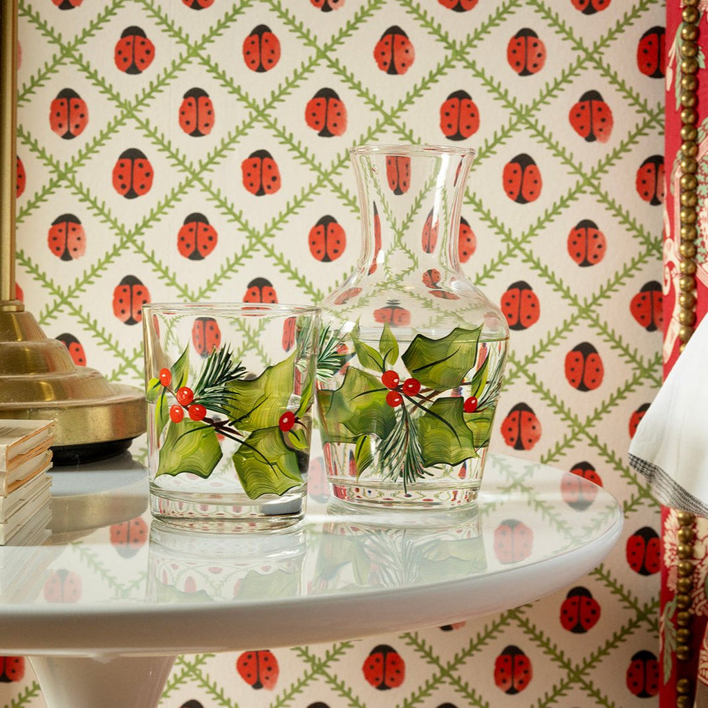 From her flagship in the Highlands of Scotland, Petra Palumbo draws from her Lebanese and Scottish heritage to form the colorful designs and unique aesthetic of her timeless homewares. The Holly Carafe & Tumbler is delicately hand-painted with festive holly leaves and red berries, bringing a joyful spirit to seasonal gatherings. A timeless gift or heirloom, this set infuses holiday tables with warmth and tradition.