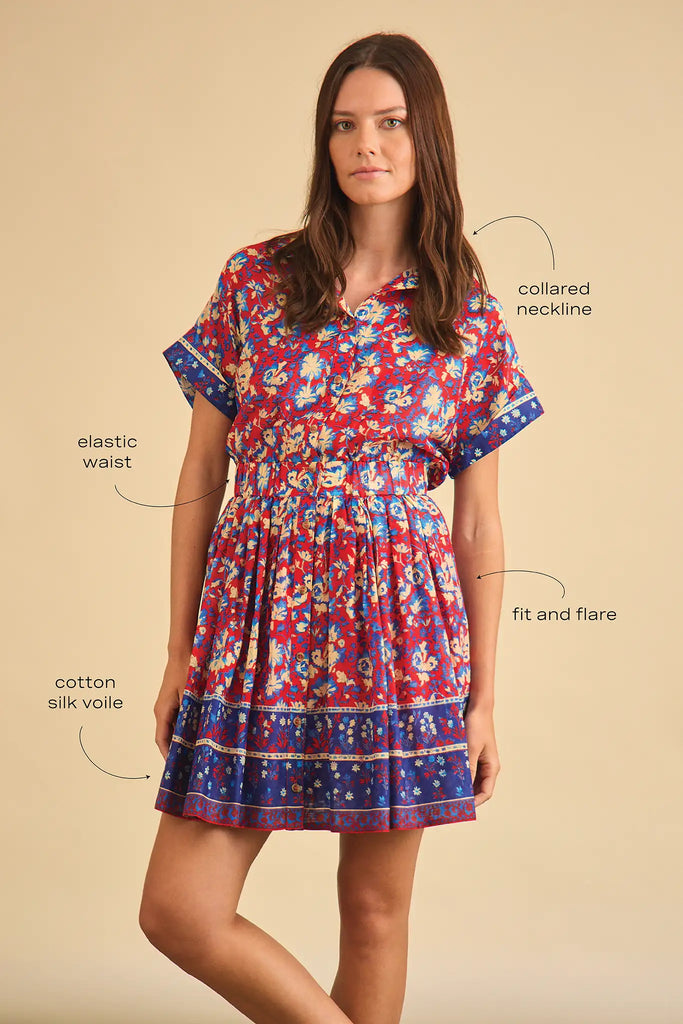 Hunter Bell brings joyful, polished pieces to life with a distinctive mix of bold pattern, thoughtful tailoring, and feminine charm. The bestselling Howard Dress returns in the rich, moody Tapestry Floral print—bringing elevated ease to every day. This beloved silhouette features a relaxed collared bodice, banded short sleeves, and a full shirred skirt for graceful volume. An elastic waist defines the shape while providing all-day comfort, and a full button front adds versatile polish. From morning coffee runs to evening plans, Howard remains an effortless go-to.