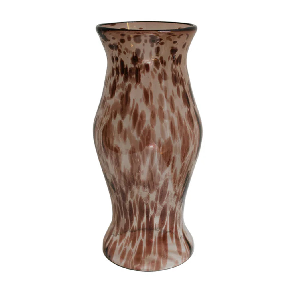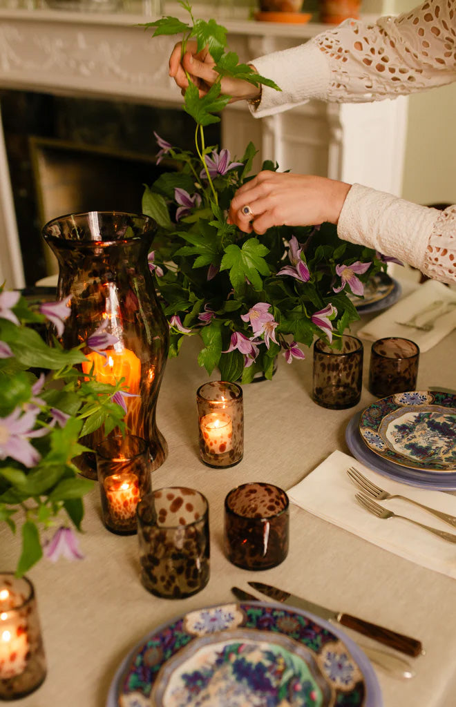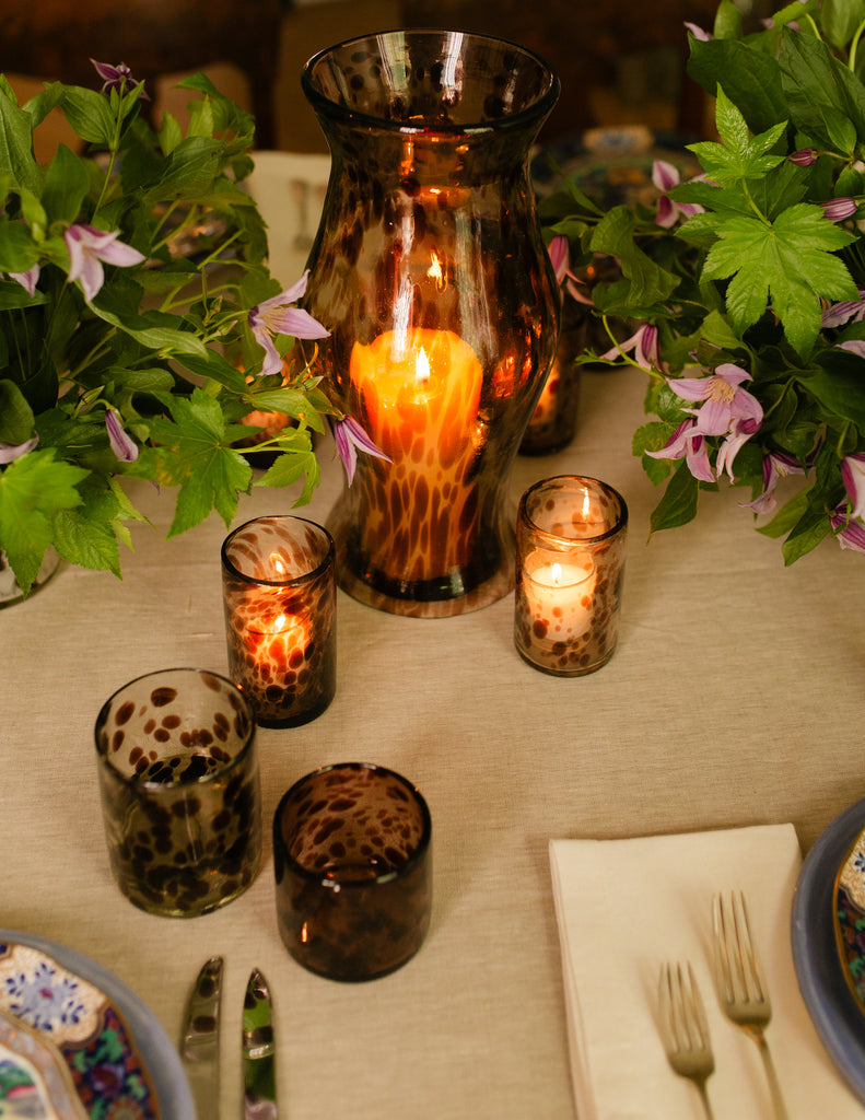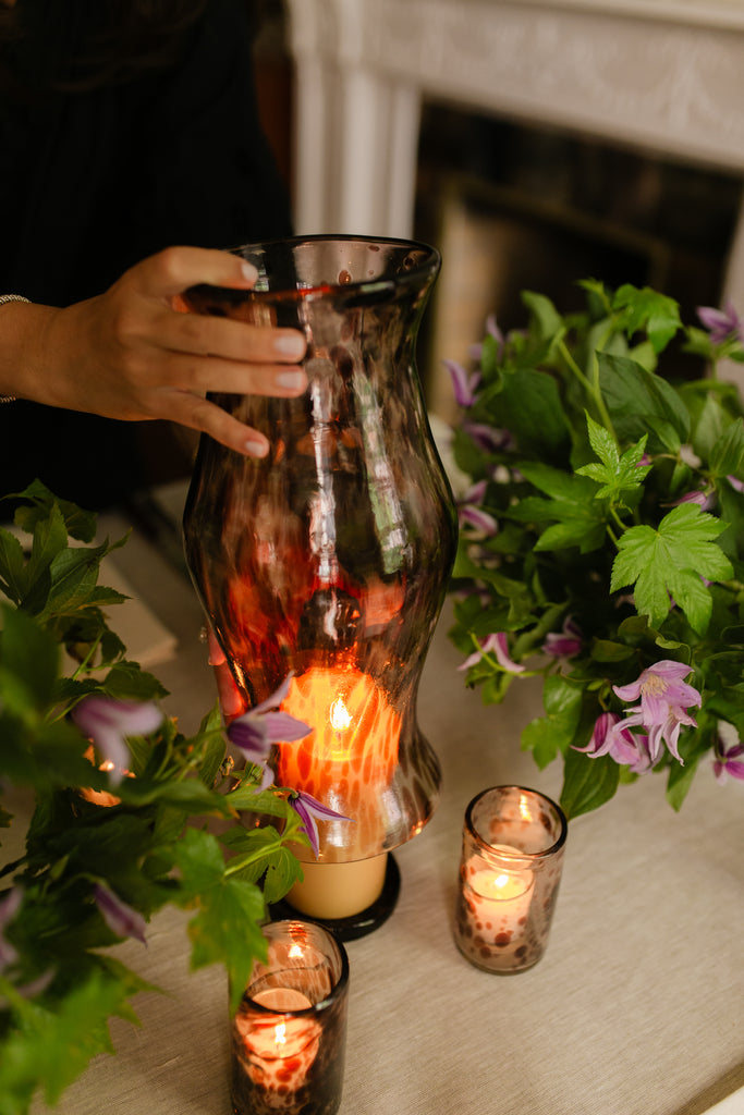 Crafted from recycled glass and blown in Mexico, this 14" hurricane features a 5.5" opening and a classic, artisan shape. The amethyst marble finish—a moody blend of plum, smoky brown, and soft lavender tones—gives off a warm, pattern glow when lit.