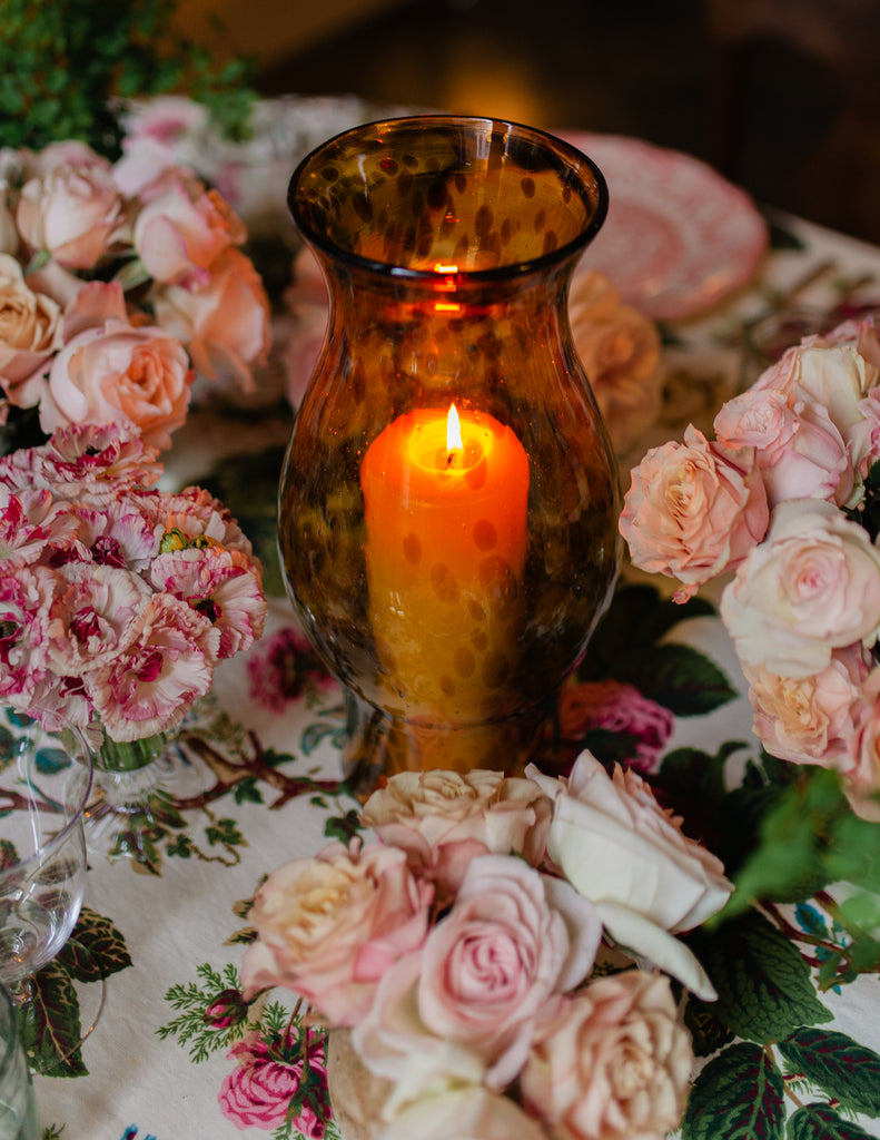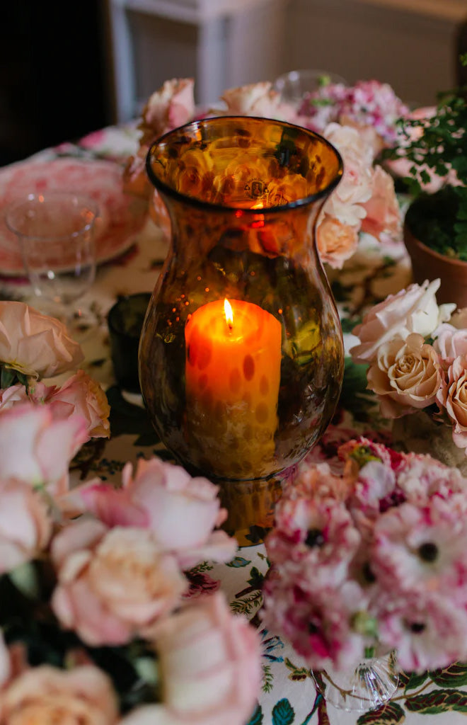 Crafted from recycled glass and blown in Mexico, this 14" hurricane features a 5.5" opening and a classic, versatile shape. The tortoiseshell coloration—a mottled mix of golden amber and deep espresso tones—casts a beautifully warm, patterned glow when lit. Its marbled tones add depth and texture to any table or room.