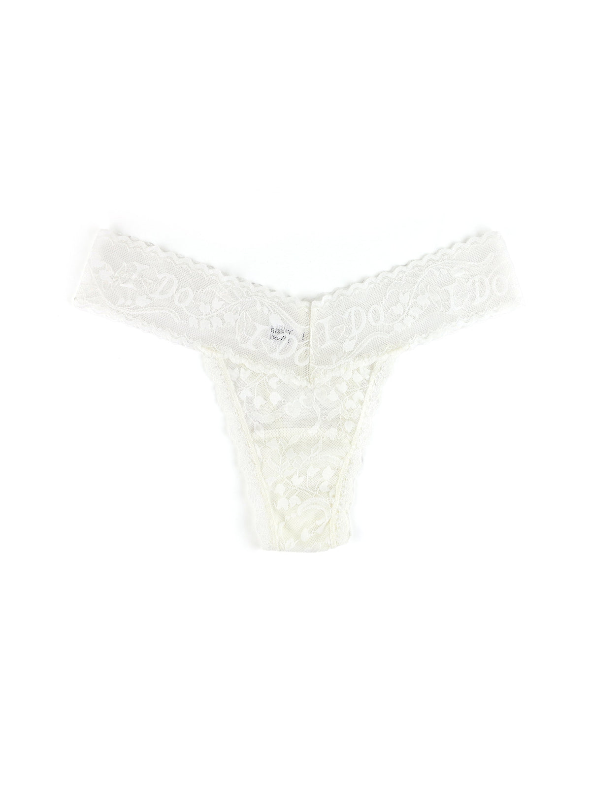 Hanky Panky's signature V-front and V-back waistband revolutionized the world of lingerie 30 years ago and has put an end to panty-lines. Soft and stretchy, Hanky Panky officially makes the World's Most Comfortable Thong. Fitting low on the hips and easily transported, the brand's famous low cut underwear gets a wedding night upgrade with "I Do" embellishment on the lace waistband of the I Do Shimmer Low Rise Thong.