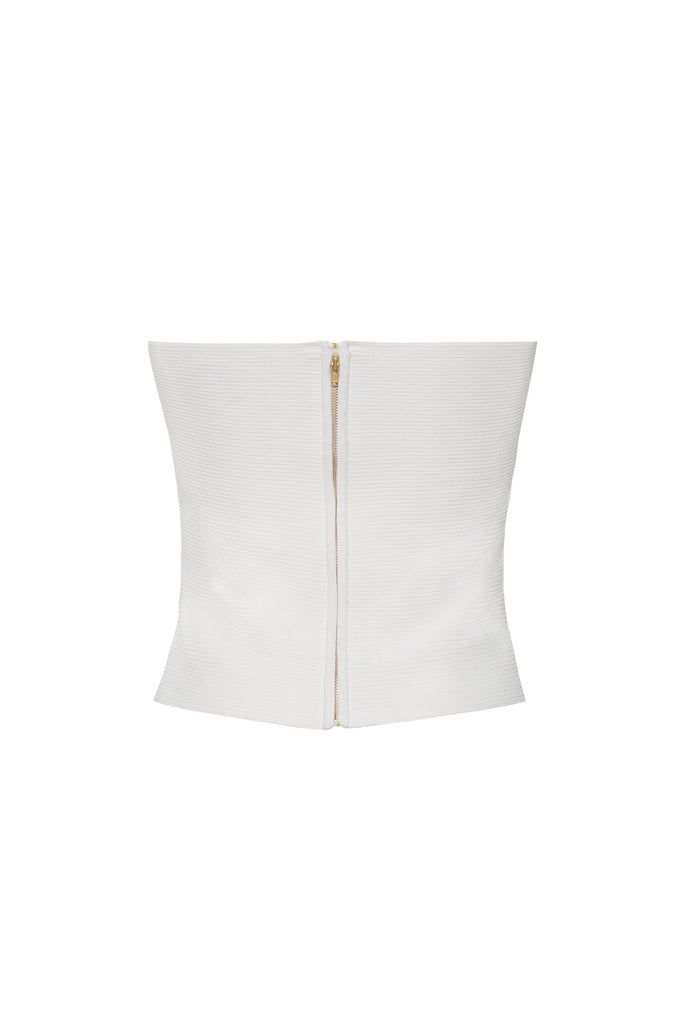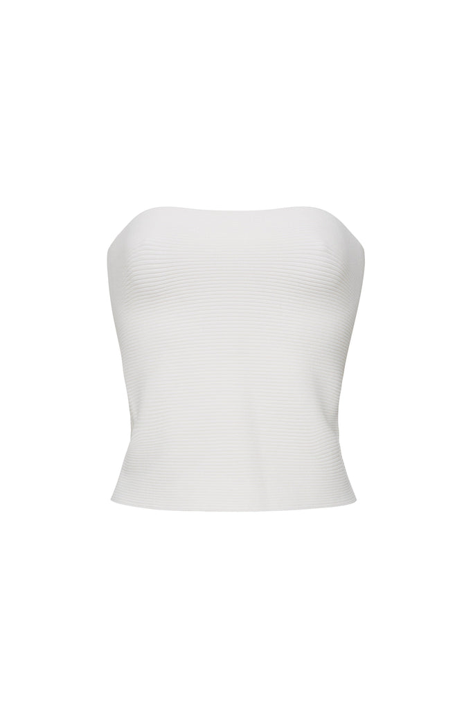 Fitted tube top in Ottoman rib knit. Center back gold zipper closure. Structured knit construction designed to contour the body.