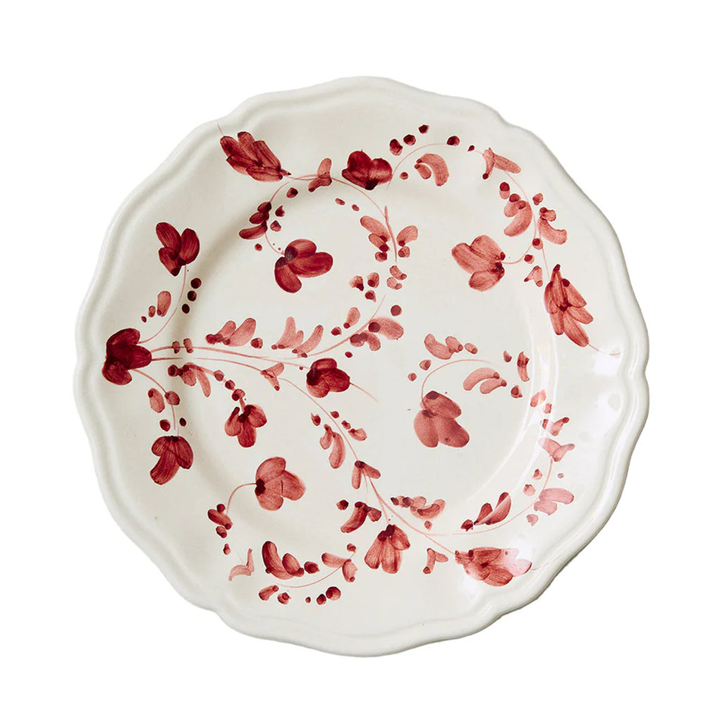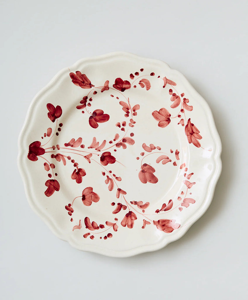 The Flora Dinner Plate in Burgundy captures the romantic spirit and timeless craftsmanship of the Flora Collection. Inspired by 18th-century central Italian ceramics, each plate reflects Antonello Radi’s passion for antiques through its graceful form and delicate floral detailing. Handmade and hand-painted in Italy from rich red terracotta, this piece brings warmth, heritage, and elegance to the modern table.