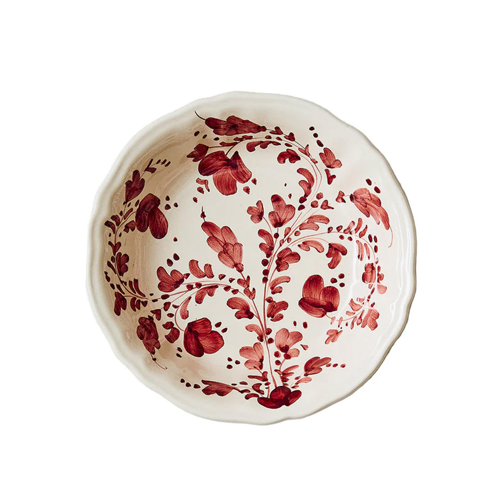 The Flora Small Serving Bowl in Burgundy embodies the charm and craftsmanship that define the Flora Collection. Inspired by 18th-century Italian ceramics and Antonello Radi’s passion for antique forms, each bowl is handmade and hand-painted in Italy from red terracotta. Its delicate floral motifs and timeless silhouette make it a beautiful vessel for serving or display—an heirloom piece that celebrates romance and enduring design.