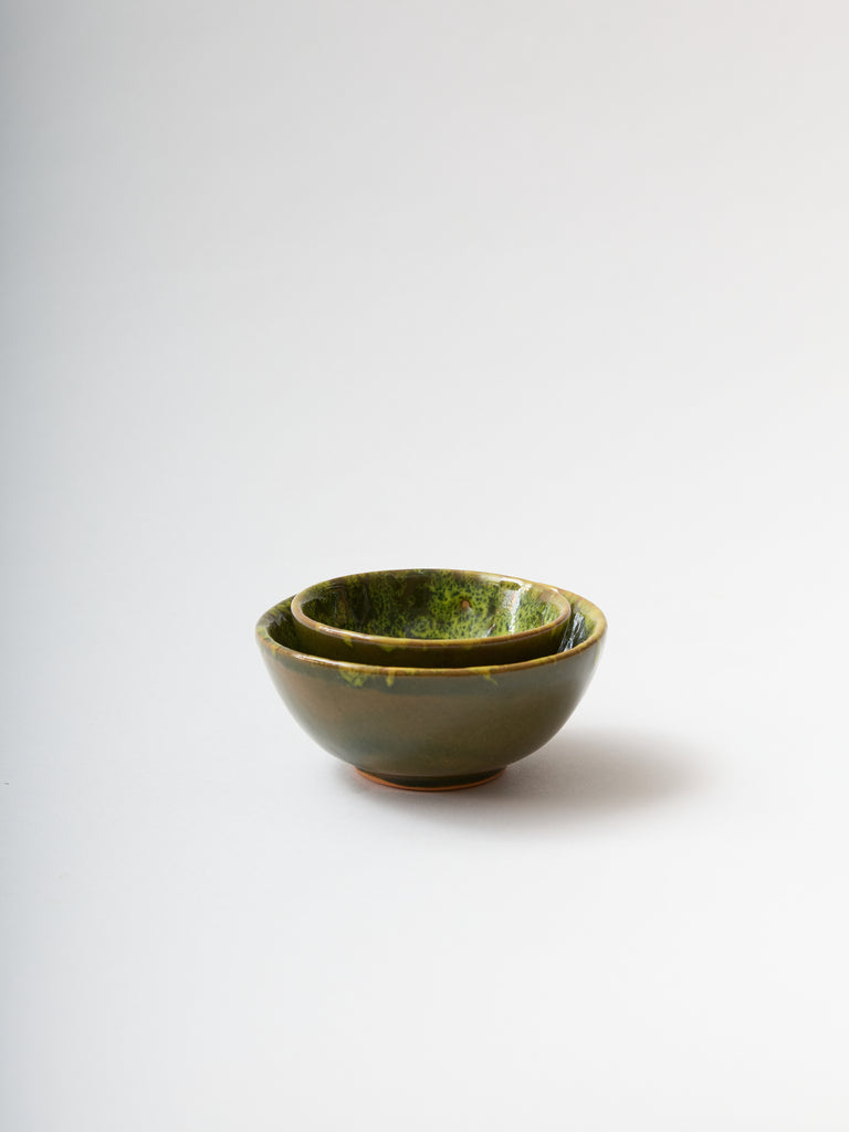 The Moss Terracotta Oil & Salt Dish Set captures the serene beauty of the Umbrian landscape. Inspired by the moss-covered forests (*bosco*) that blanket the region’s rolling hills, Antonello Radi developed a distinctive glaze technique on red terracotta to evoke their organic textures and tones. Each plate is handmade and glazed in Italy, resulting in subtle variations that make every piece a one-of-a-kind expression of natural artistry—equally suited to refined or rustic tablescapes.