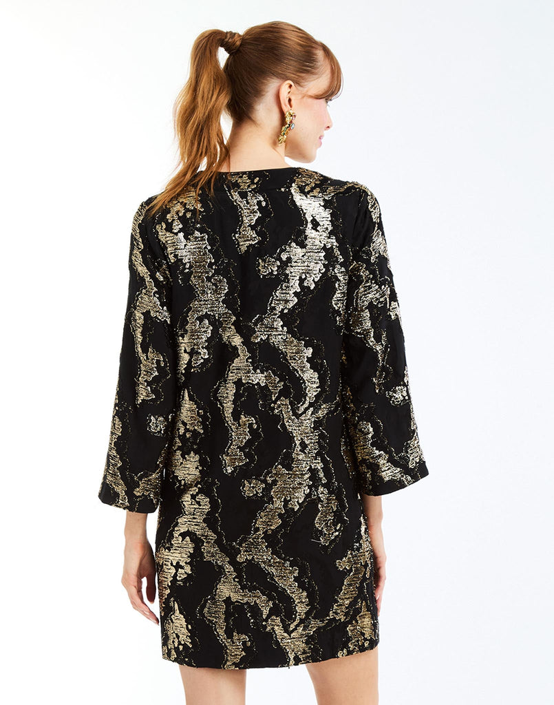 The Ines Mini Dress in Black & Gold Metallic redefines effortless cocktail dressing with a relaxed yet refined silhouette. Crafted in a shimmering lurex blend, this shift-style mini draws inspiration from the djellaba with its signature notch collar and subtle bell sleeves. Functional side pockets add ease to its luminous design, making it a sophisticated choice for cocktail parties, evening gatherings, and festive occasions alike.