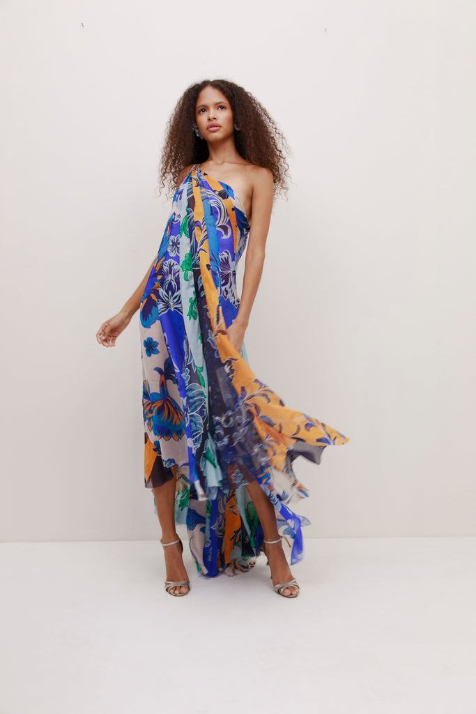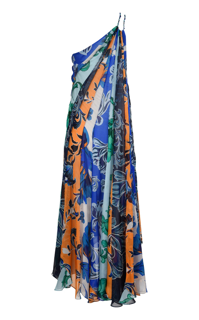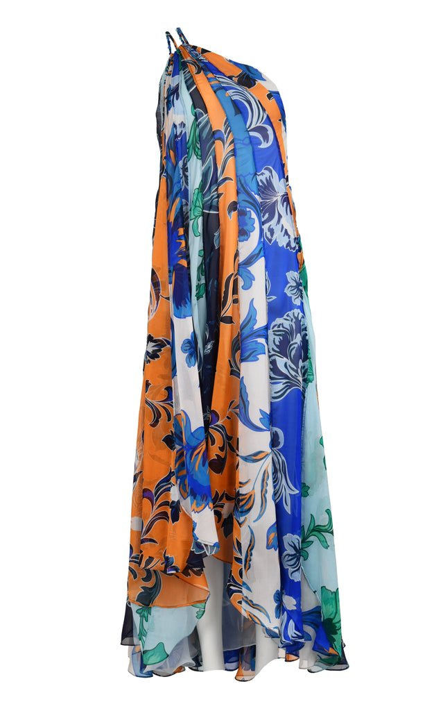 From her atelier in Barranquilla, Colombia, Francesca Miranda combines the diverse, indigenous aesthetic of her surroundings, as well as her own European roots, to produce sumptuous womenswear, bridal, and household objects, each bearing the essential spirit of artistry and craftsmanship. The Iris Dress captivates with its one-shoulder silhouette and cascading printed silk chiffon, designed to move with grace and ease. A study in contrast, it combines fluidity and boldness in striking harmony for an effortlessly elegant statement.
