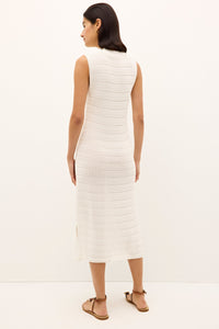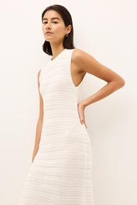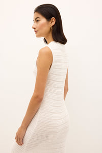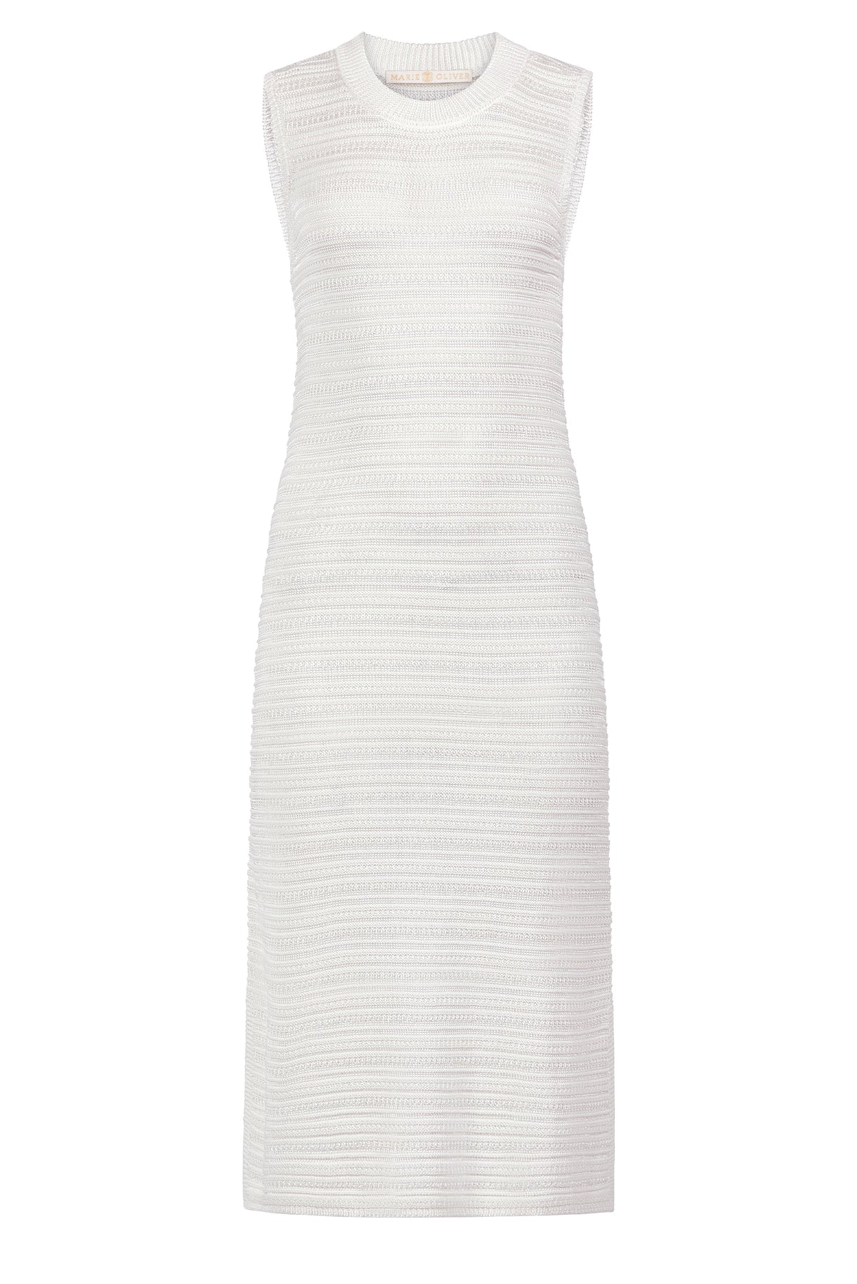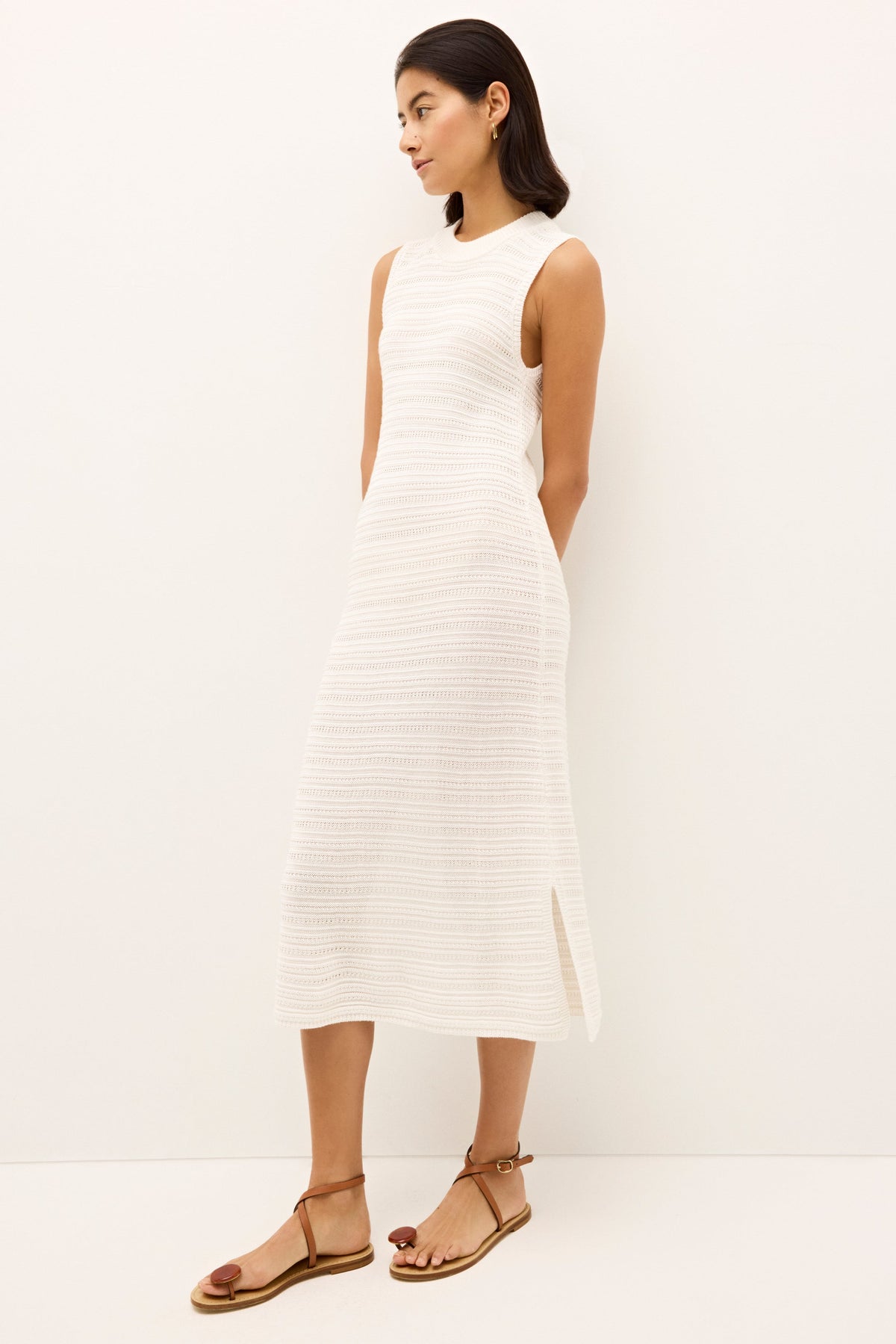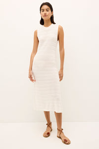 Empowering women through vivid hues and the joy of style, Sarah Doggett Evenson uses her archive of artistic prints, fine fabrics, and flattering silhouettes to make each Marie Oliver piece instantly uplifting. The Isla Dress in White has a classic crew neck, flattering fit, and subtly lustrous horizontal rib knit. It’s a seasonal staple shown here in fresh summer white.