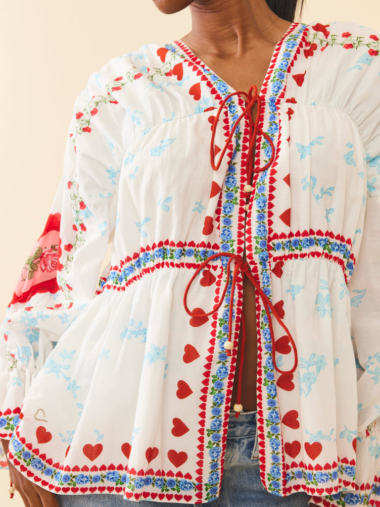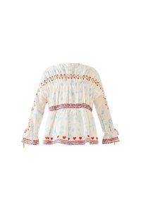 Tomboy looks, girly-girl styles, and an always fashionable approach define Eddy’s aesthetic. With a focus on bold and feminine silhouettes, Eddy dresses and tops pair elevated California bohemian with global inspiration; these are clothes designed to make you feel good inside and out. The Isle Top in Alfie White is crafted from airy cotton with a floaty, gathered silhouette that moves with ease. Scalloped hems and cuffs are embroidered with delicate daisies, while soft blue ties add a vintage-inspired charm. Light, airy and full of quiet romance, this piece blurs the line between daydreams of vintage pasts and modern ease.