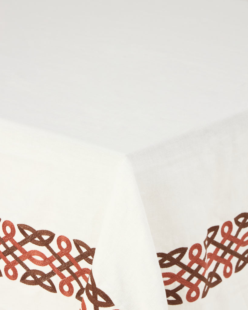 Inspired by the pages of Cabana—a magazine for a new generation of globetrotters—Casa Cabana’s homewares both explore and expand the worlds we share with our interiors. The Terracotta Collection is a stunning ode to Italy's visual identity, defined by the rich, earthy tones of the country’s natural landscape, its celebrated terracotta rooftops, and sunbaked joie de vivre. The Terracotta Embroidered Linen Tablecloth in Ivory is crafted from 100% linen and finished with an intricate embroidered border in a geometric motif inspired by 9th-century interlacement bands. Wrapped in a matching patterned bag, it offers an elegant solution for storage.