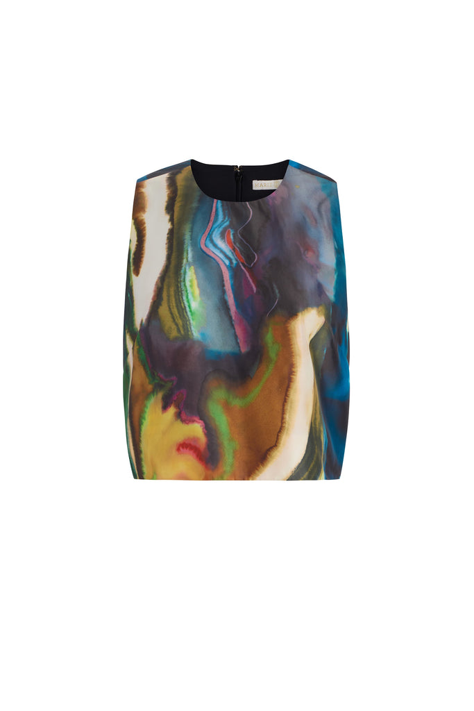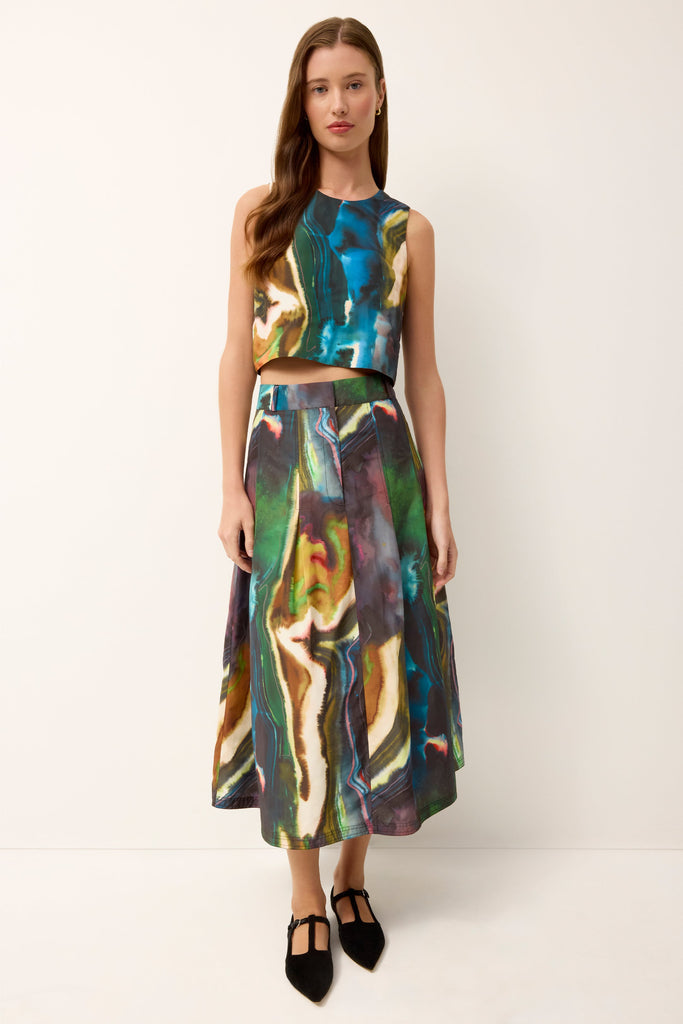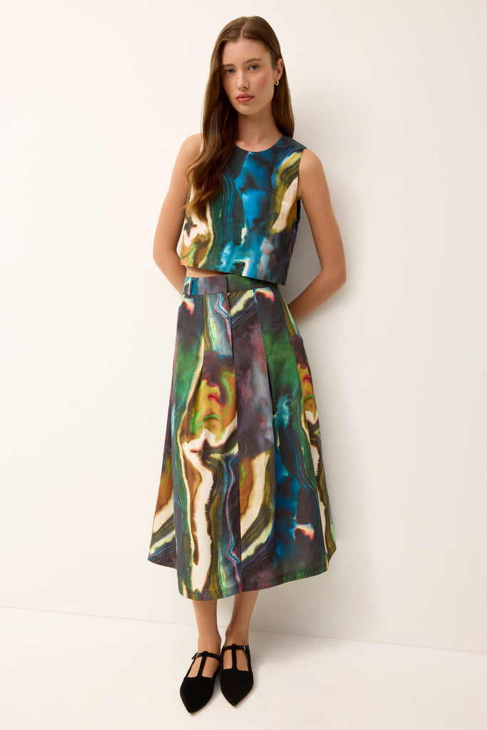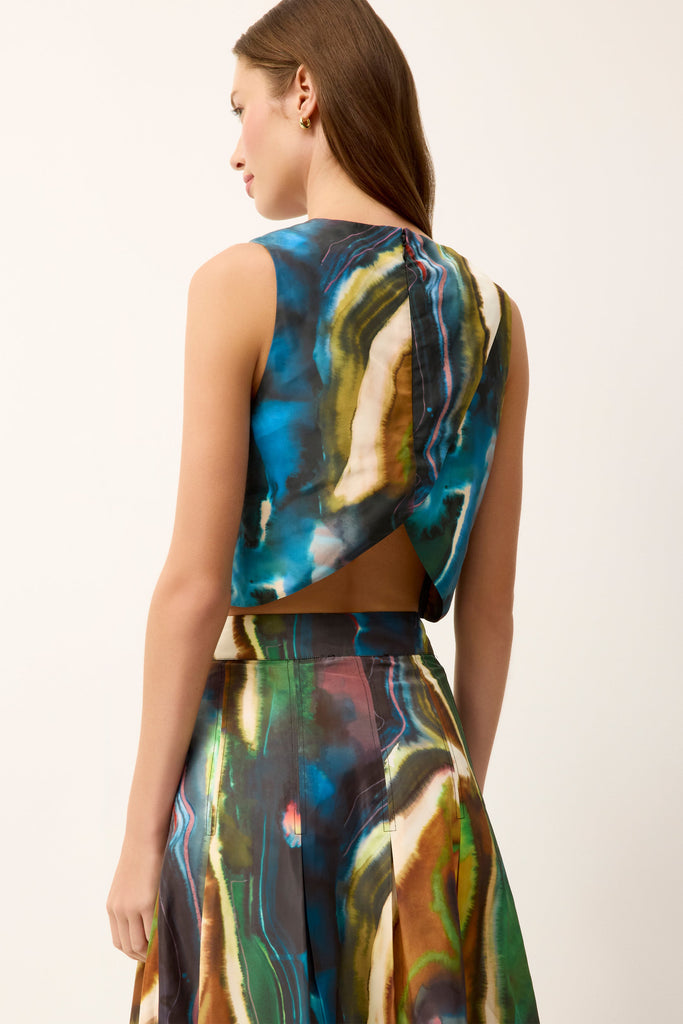 Empowering women through vivid hues and the joy of style, Sarah Doggett Evenson uses her archive of artistic prints, fine fabrics, and flattering silhouettes to make each Marie Oliver piece instantly uplifting. The Jamie Top in Delta features a slightly cropped A-line silhouette and our colorful, geological-inspired Delta print. Panels cross over in the back, creating a singular shape that pairs effortlessly with the matching Faith skirt for an editorial edge.