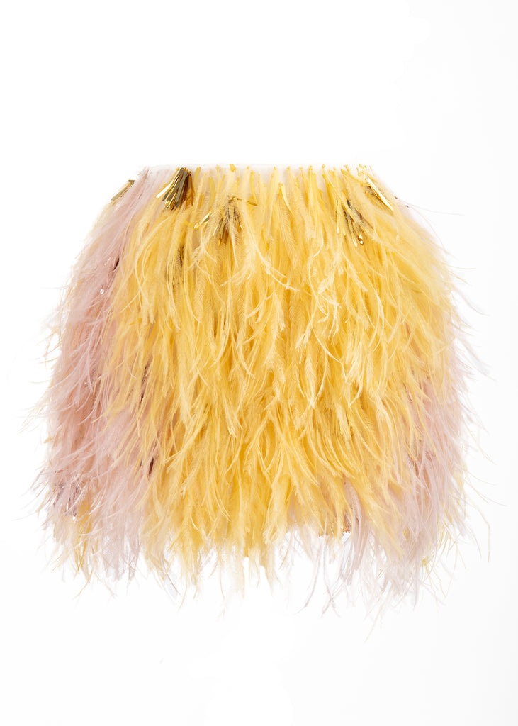 Fully embroidered with real feathers and metallic fringe. Mini length. Please contact customercare@overthemoon.com if you are interested in scheduling a private fitting in New York City.