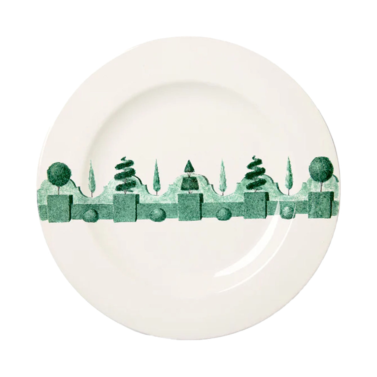 Founded by Costanza Paravicini, and taking inspiration from the classic tradition of fine Italian pottery, Laboratorio Paravicini seeks to create handmade tableware and plates as they were in long ago, but made today, for everyday use. Using a decoration technique called Gran Fuoco sulla Terraglia Bianca, the patterns under glaze emerge as uniquely bright and durable. The Jardin á L'Italienne Dinner Plate 02 evokes a metaphysical atmosphere in which vegetation sheds its spontaneity to become architecture in a suspended, timeless landscape. Each piece is finished and decorated by hand.