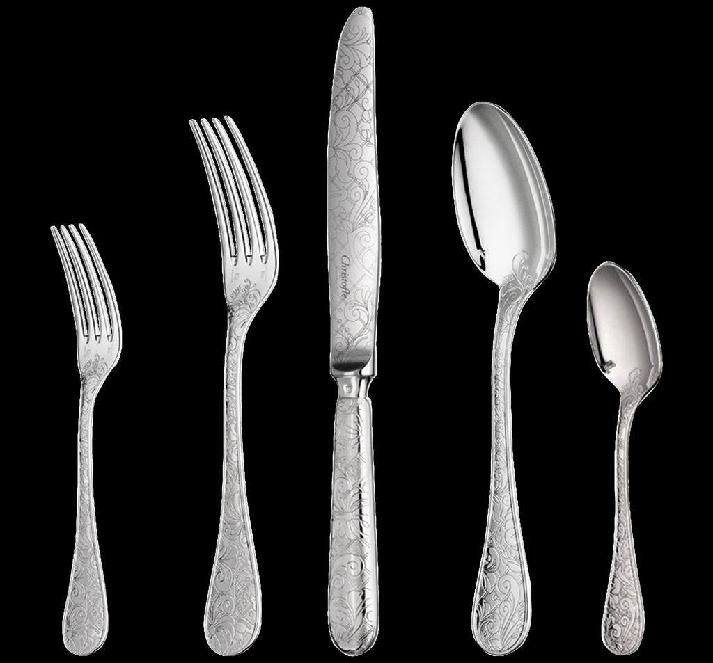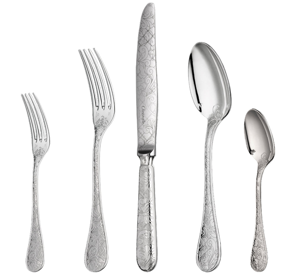 Set of 5. Silver-plated. Includes dinner fork, dinner knife, standard soup spoon, after-dinner teaspoon, and dessert fork. Part of the Jardin d’Eden collection, characterized by intricate floral and botanical engravings. Gift boxed.