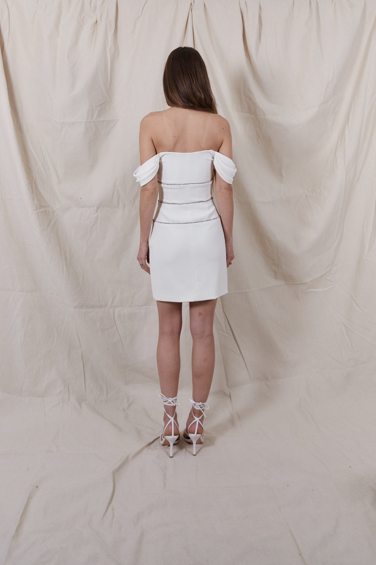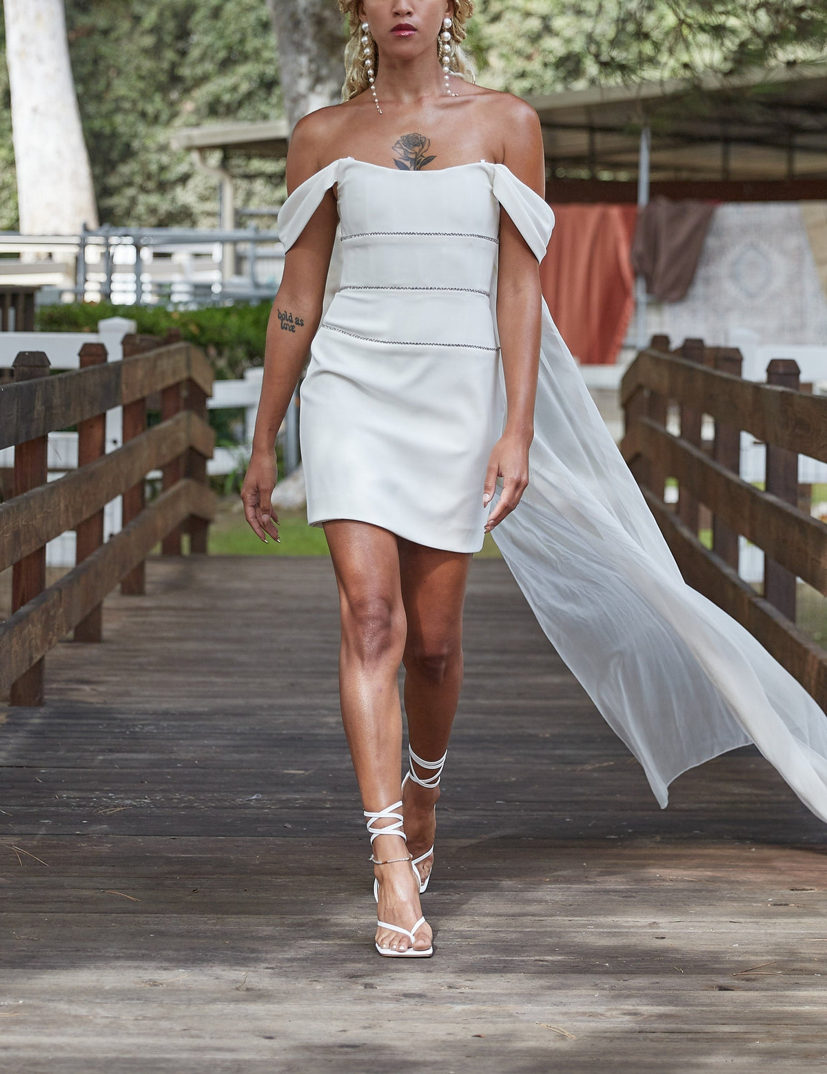After creating evening wear and couture bridal for the likes of Hailey Bieber, Kerry Washington, Jennifer Lopez and Kate Hudson, Kate Polk shares her iconic bridal with Houghton by Katharine Polk. Applying a keen eye for fashion and decades of experience, each Houghton design is an ideal expression of tradition and contemporary; the perfect combination to carry you through your most special of days. The Jemma Mini Dress with Detachable Chiffon Train is a cocktail dress in crepe, with crystal trim and detachable chiffon cape. At once flattering and elegant, it could be your eye catching choice for a rehearsal dinner, the afterparty, your ceremony, or all three.