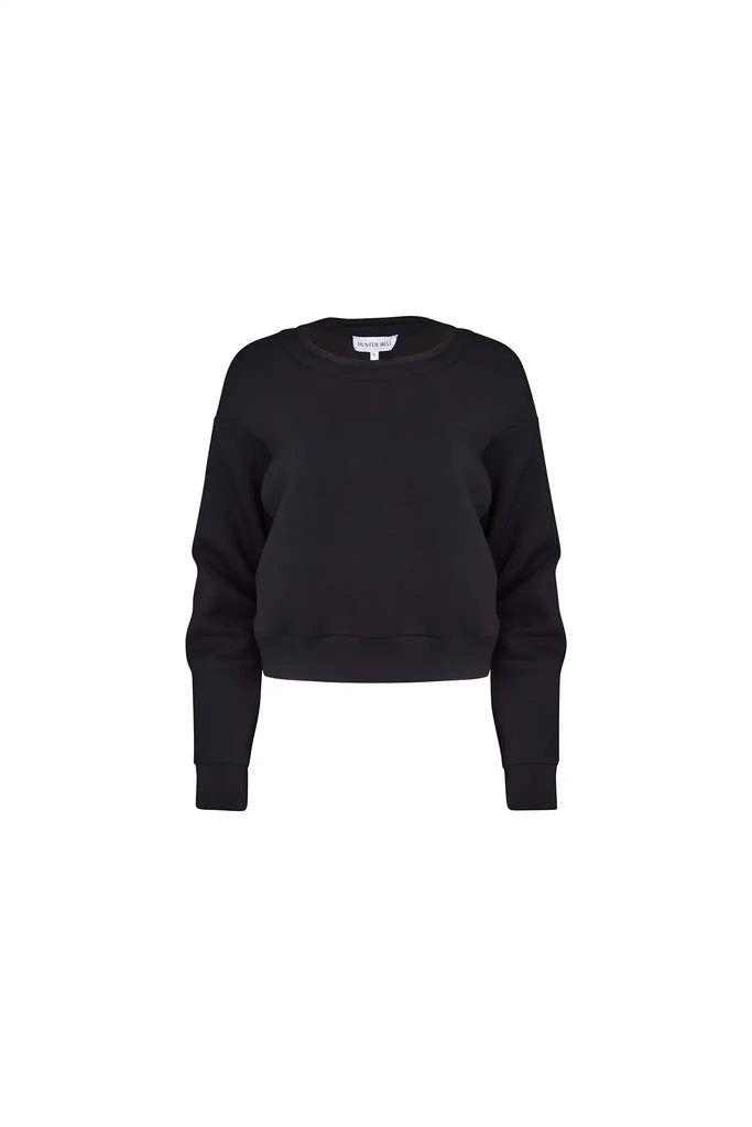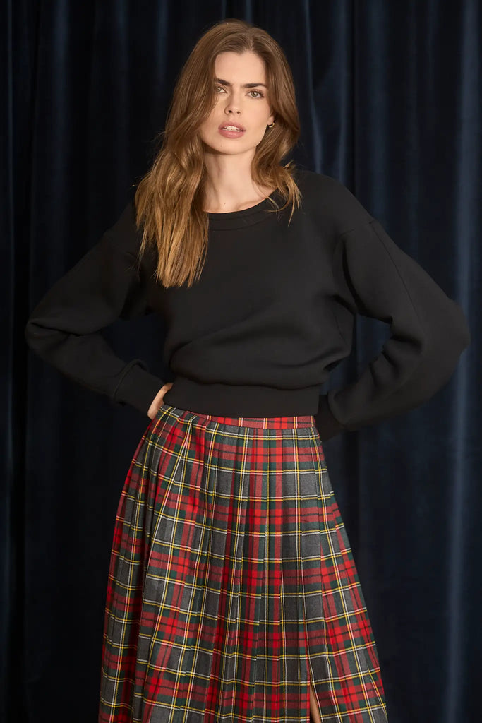 The Jennie Sweatshirt in Onyx redefines the classic crewneck with structured sophistication. Crafted from sleek scuba in deep black, it features long sleeves with precise pleating that elevate a casual staple into something distinctly polished. Finished with banded cuffs and a clean hem, this modern silhouette delivers a tailored twist on everyday ease—equally suited for weekday wear or holiday gatherings. Pair it with the Duvall Pant for a cozy, coordinated set.