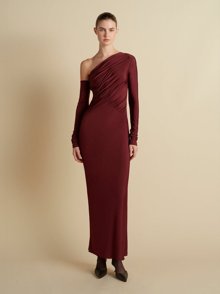 Founded in 2016 by sisters Marina and Francesca Moscone, the label gravitates toward a tactile approach, twisting and draping fabrics by hand to create a softly seductive design using custom jacquards, fil-coupés, and silk wools, all exclusively developed in Italy, rendered in precise shapes and tailoring. The Jersey One-Shoulder Draped Top in Garnet reflects this ethos with an adjustable drape for multiple styling options, crafted in a fluid stretch jersey that offers ease and elegance in equal measure. A pull-on silhouette enhances its effortless appeal.