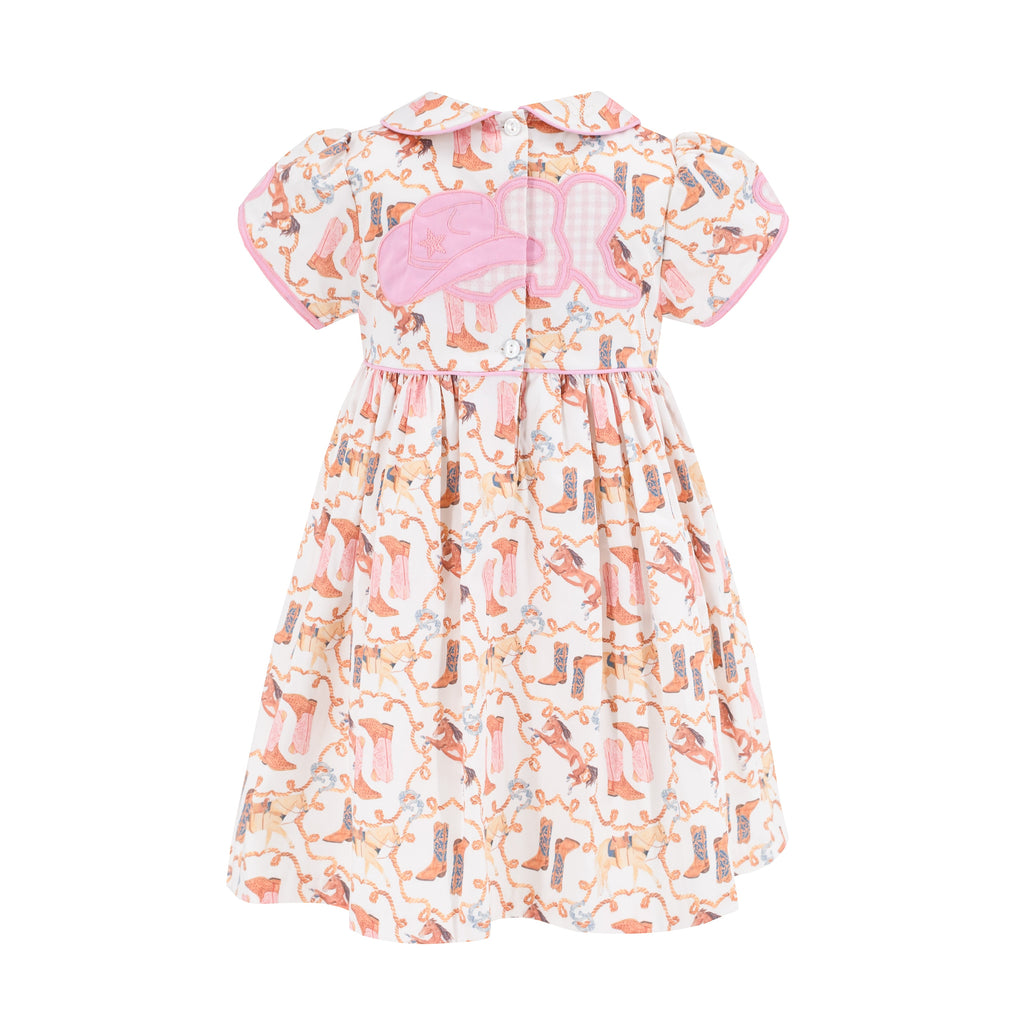 Inspired by the beauty of motherhood, Dondolo is a luxury lifestyle brand that provides beautiful, heirloom-quality clothing for generations to come. Each design is thoughtfully crafted in Colombia with ethical manufacturing, making every piece even more special. The Jessie Girl Dress is a beloved favorite reimagined with charming new details and Western flair. Illustrated by Catherine Cartie and crafted from soft Spanish cotton, this sweet silhouette features a Peter Pan collar, delicate pink piping at the chest, and puff sleeves embroidered with dainty hearts. A playful appliqué of boots and a cowgirl hat adds storybook whimsy to the back, making it a standout for portraits, celebrations, and everyday magic.