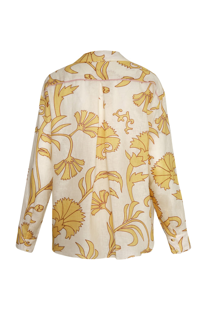 Founded in Cali, Colombia, Juan de Dios channels the spirit of Latin American sophistication through timeless, handcrafted design. The Jill Linen Shirt in Yellow Flowers is a study in elevated simplicity and subtle whimsy. Cut from lightweight embroidered linen, this straight-cut shirt features a stand collar, long sleeves with buttoned cuffs, and a contrast-trimmed yoke for a touch of refined detail. Finished with covered buttons, it’s a versatile piece that transitions effortlessly from day to night.