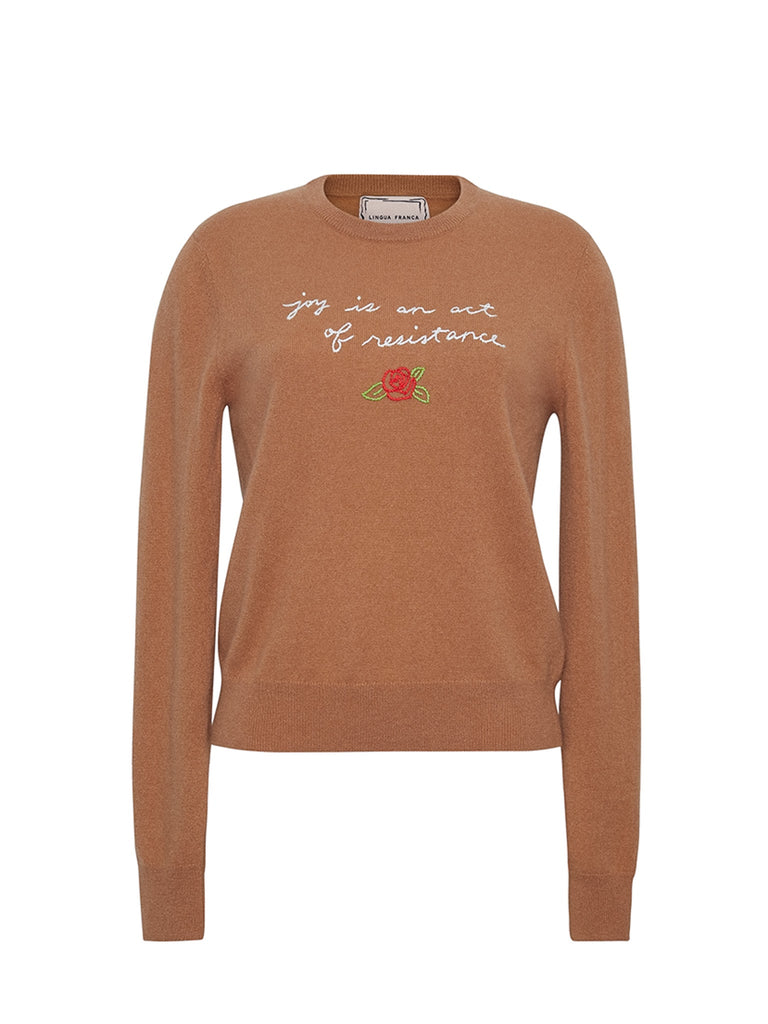Lingua Franca is a line of sustainably-sourced, fair trade luxury ready-to-wear and cashmere pieces, all hand-stitched by women in New York City. The Joy is an Act of Resistance Crewneck in Camel is a signature Lingua Franca statement piece, featuring the hand-embroidered phrase “Joy is an Act of Resistance” alongside a delicate rose motif. Crafted from 100% cashmere, this classic crewneck combines warmth, craftsmanship, and purpose in equal measure.
