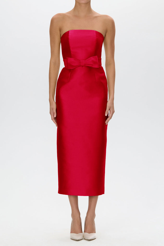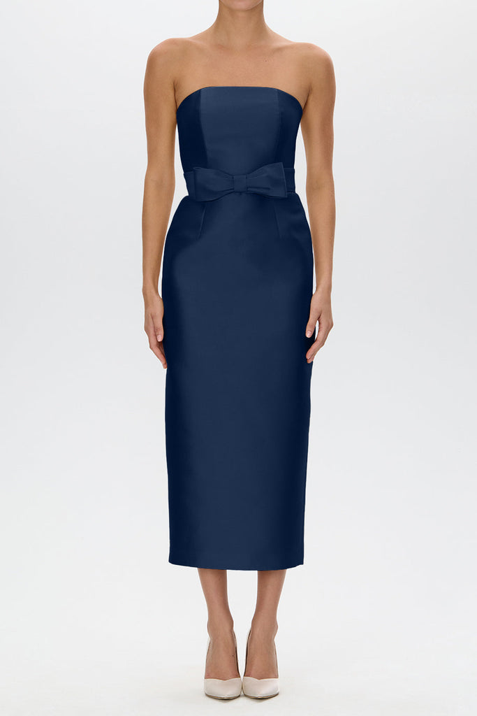 The Juliette Silk and Wool Midi Dress with Bow Belt from the Alexia María 2026 Collection is a refined expression of modern elegance. Crafted in a luxurious silk and wool blend, this strapless silhouette features a structured bodice that defines the waist before falling into a sleek midi-length pencil skirt. A removable bow belt introduces a delicate feminine accent, allowing the look to transition effortlessly from understated cocktail dressing to more elevated styling. Handcrafted in the California atelier, Juliette offers seasonless versatility with a polished, minimalist sensibility.